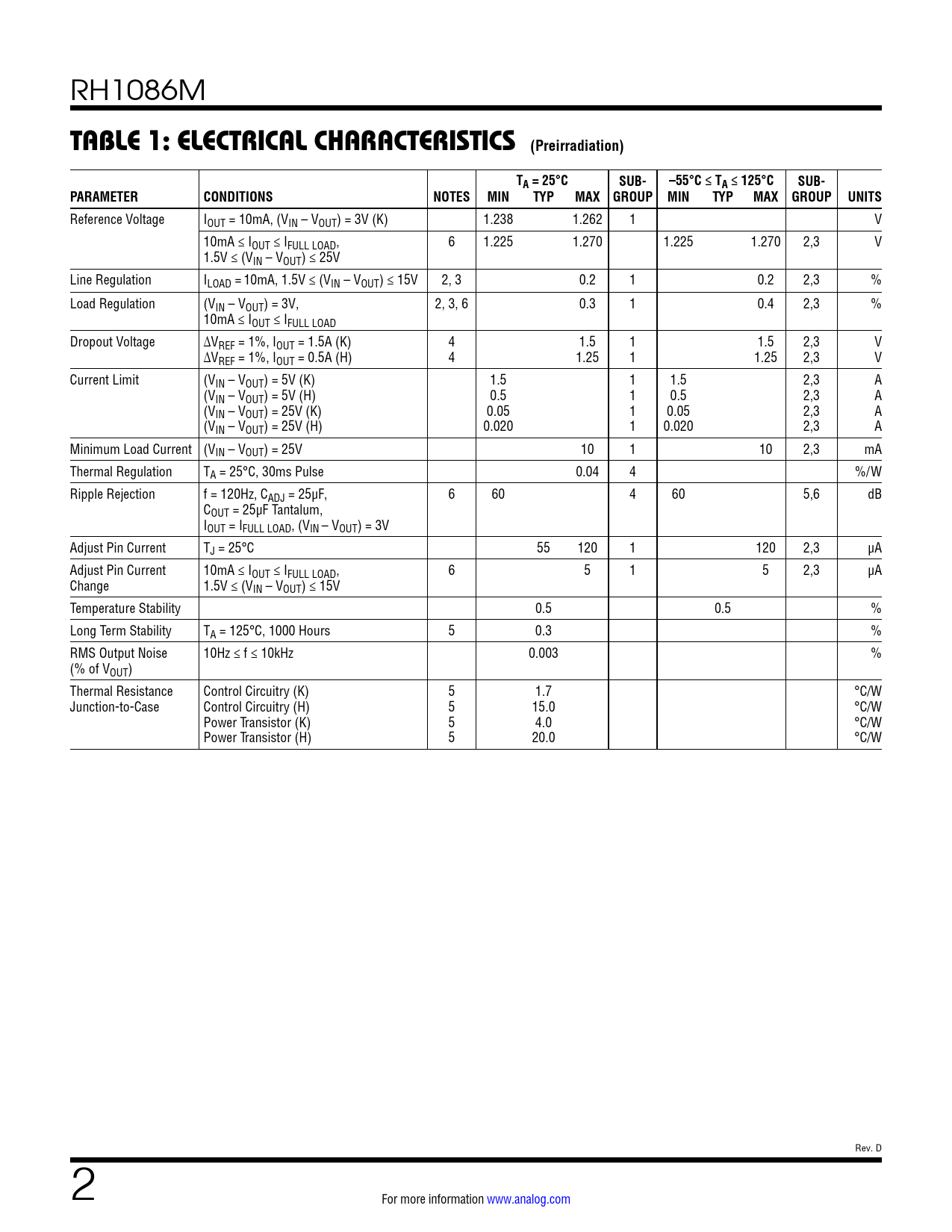 Reference Voltage IOUT = 10mA, (VIN – VOUT) = 3V (K) 1.238 1.262 1 V 10mA ≤ IOUT ≤ IFULL LOAD, 6 1.225 1.270 1.225 1.270 2,3 V 1.5V ≤ (VIN – VOUT) ≤ 25V Line Regulation ILOAD = 10mA, 1.5V ≤ (VIN – VOUT) ≤ 15V 2, 3 0.2 1 0.2 2,3 % Load Regulation (VIN – VOUT) = 3V, 2, 3, 6 0.3 1 0.4 2,3 % 10mA ≤ IOUT ≤ IFULL LOAD Dropout Voltage ∆VREF = 1%, IOUT = 1.5A (K) 4 1.5 1 1.5 2,3 V ∆VREF = 1%, IOUT = 0.5A (H) 4 1.25 1 1.25 2,3 V Current Limit (VIN – VOUT) = 5V (K) 1.5 1 1.5 2,3 A (VIN – VOUT) = 5V (H) 0.5 1 0.5 2,3 A (VIN – VOUT) = 25V (K) 0.05 1 0.05 2,3 A (VIN – VOUT) = 25V (H) 0.020 1 0.020 2,3 A Minimum Load Current (VIN – VOUT) = 25V 10 1 10 2,3 mA Thermal Regulation TA = 25°C, 30ms Pulse 0.04 4 %/W Ripple Rejection f = 120Hz, CADJ = 25µF, 6 60 4 60 5,6 dB COUT = 25µF Tantalum, IOUT = IFULL LOAD, (VIN – VOUT) = 3V Adjust Pin Current TJ = 25°C 55 120 1 120 2,3 µA Adjust Pin Current 10mA ≤ IOUT ≤ IFULL LOAD, 6 5 1 5 2,3 µA Change 1.5V ≤ (VIN – VOUT) ≤ 15V Temperature Stability 0.5 0.5 % Long Term Stability TA = 125°C, 1000 Hours 5 0.3 % RMS Output Noise 10Hz ≤ f ≤ 10kHz 0.003 % (% of VOUT) Thermal Resistance Control Circuitry (K) 5 1.7 °C/W Junction-to-Case Control Circuitry (H) 5 15.0 °C/W Power Transistor (K) 5 4.0 °C/W Power Transistor (H) 5 20.0 °C/W Rev. D 2 For more information www.analog.com Document Outline Description Burn-In Circuit Package Information Absolute Maximum Ratings Preconditioning Table 1: Electrical Characteristics Table 1a: Electrical Characteristics Table 2: Electrical Test Requirements Total Dose Bias Circuit Typical Performance Characteristics Revision History
