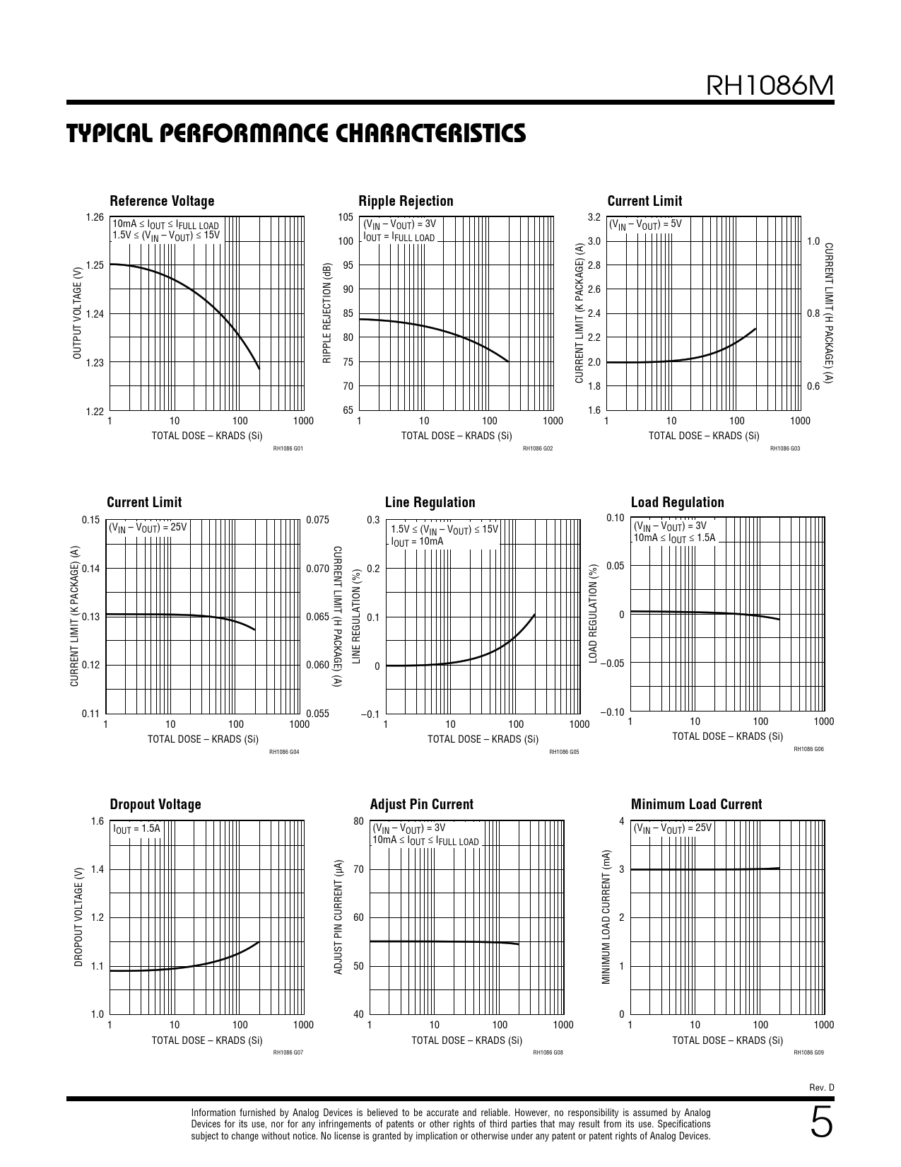 RH1086M TYPICAL PERFORMANCE CHARACTERISTICSReference VoltageRipple RejectionCurrent Limit 1.26 105 3.2 10mA ≤ IOUT ≤ IFULL LOAD (VIN – VOUT) = 3V (VIN – VOUT) = 5V 1.5V ≤ (VIN – VOUT) ≤ 15V 100 IOUT = IFULL LOAD 3.0 1.0 CURRENT LIMIT (H PACKAGE) (A) 1.25 95 2.8 90 2.6 1.24 85 2.4 0.8 80 2.2 OUTPUT VOLTAGE (V) 1.23 RIPPLE REJECTION (dB) 75 2.0 70 CURRENT LIMIT (K PACKAGE) (A) 1.8 0.6 1.22 65 1.6 1 10 100 1000 1 10 100 1000 1 10 100 1000 TOTAL DOSE – KRADS (Si) TOTAL DOSE – KRADS (Si) TOTAL DOSE – KRADS (Si) RH1086 G01 RH1086 G02 RH1086 G03 Current LimitLine RegulationLoad Regulation 0.15 0.075 0.10 0.3 (VIN – VOUT) = 25V (V 1.5V ≤ (V IN – VOUT) = 3V IN – VOUT) ≤ 15V CURRENT LIMIT (H PACKAGE) (A) 10mA ≤ I I OUT ≤ 1.5A OUT = 10mA 0.14 0.070 0.05 0.2 0.13 0.065 0 0.1 0.12 0.060 LINE REGULATION (%) LOAD REGULATION (%) –0.05 0 CURRENT LIMIT (K PACKAGE) (A) 0.11 0.055 –0.10 –0.1 1 10 100 1000 1 10 100 1000 1 10 100 1000 TOTAL DOSE – KRADS (Si) TOTAL DOSE – KRADS (Si) TOTAL DOSE – KRADS (Si) RH1086 G04 RH1086 G06 RH1086 G05 Dropout VoltageAdjust Pin CurrentMinimum Load Current 1.6 80 4 IOUT = 1.5A (VIN – VOUT) = 3V (VIN – VOUT) = 25V 10mA ≤ IOUT ≤ IFULL LOAD 1.4 70 3 1.2 60 2 DROPOUT VOLTAGE (V) 1.1 ADJUST PIN CURRENT (µA) 50 1 MINIMUM LOAD CURRENT (mA) 1.0 40 0 1 10 100 1000 1 10 100 1000 1 10 100 1000 TOTAL DOSE – KRADS (Si) TOTAL DOSE – KRADS (Si) TOTAL DOSE – KRADS (Si) RH1086 G07 RH1086 G08 RH1086 G09 Rev. D Information furnished by Analog Devices is believed to be accurate and reliable. However, no responsibility is assumed by Analog Devices for its use, nor for any infringements of patents or other rights of third parties that may result from its use. Specifications subject to change without notice. No license F o is r more granted in by f ormation implication w orw w.a other nalo wise g.com under any patent or patent rights of Analog Devices. 5 Document Outline Description Burn-In Circuit Package Information Absolute Maximum Ratings Preconditioning Table 1: Electrical Characteristics Table 1a: Electrical Characteristics Table 2: Electrical Test Requirements Total Dose Bias Circuit Typical Performance Characteristics Revision History