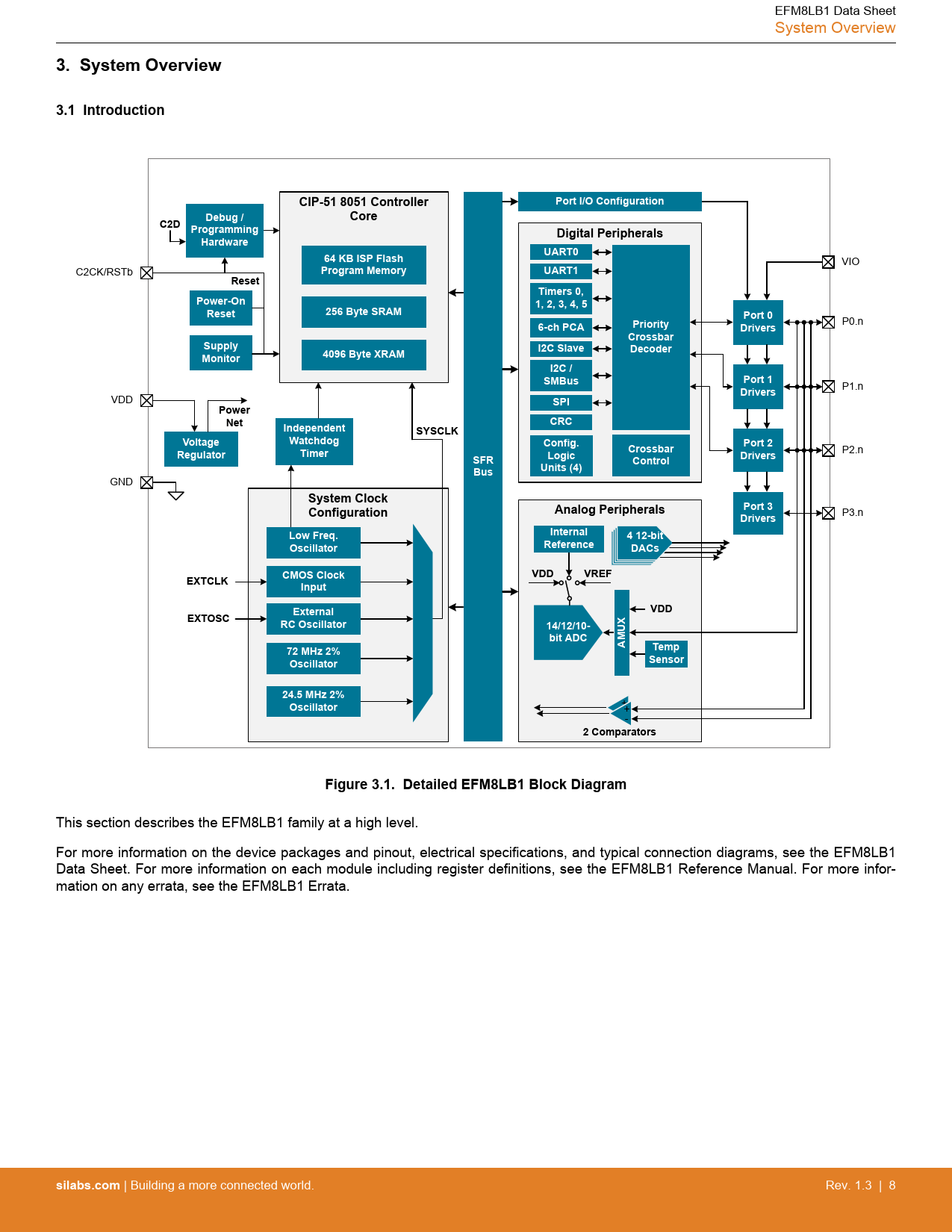 This section describes the EFM8LB1 family at a high level. For more information on the device packages and pinout, electrical specifications, and typical connection diagrams, see the EFM8LB1 Data Sheet. For more information on each module including register definitions, see the EFM8LB1 Reference Manual. For more infor- mation on any errata, see the EFM8LB1 Errata.