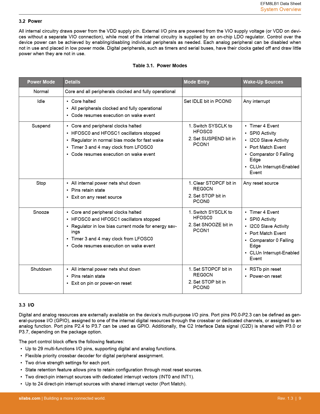 3.2 Power. Table 3.1. Power Modes. Power Mode. Details. Mode Entry. Wake-Up Sources. 3.3 I/O. silabs.com
