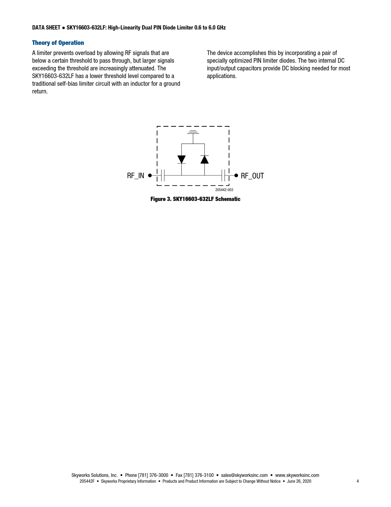 DATA SHEET ● SKY16603-632LF: High-Linearity Dual PIN Diode Limiter 0.6 to 6.0 GHzTheory of Operation A limiter prevents overload by allowing RF signals that are The device accomplishes this by incorporating a pair of below a certain threshold to pass through, but larger signals specially optimized PIN limiter diodes. The two internal DC exceeding the threshold are increasingly attenuated. The input/output capacitors provide DC blocking needed for most SKY16603-632LF has a lower threshold level compared to a applications. traditional self-bias limiter circuit with an inductor for a ground return. Figure 3. SKY16603-632LF Schematic Skyworks Solutions, Inc. • Phone [781] 376-3000 • Fax [781] 376-3100 • sales@skyworksinc.com • www.skyworksinc.com 205442F • Skyworks Proprietary Information • Products and Product Information are Subject to Change Without Notice • June 26, 2020 4