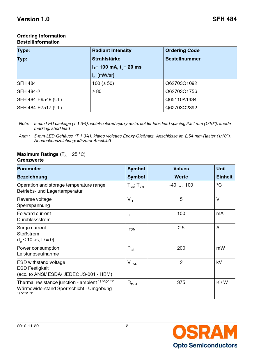 Ie [mW/sr] SFH 484 100 (≥ 50) Q62703Q1092 SFH 484-2 ≥ 80 Q62703Q1756 SFH 484-E9548 (UL) Q65110A1434 SFH 484-E7517 (UL) Q62703Q2392 Note: 5 mm LED package (T 1 3/4), violet-colored epoxy resin, solder tabs lead spacing 2.54 mm (1/10’’), anode marking: short lead Anm.: 5-mm-LED-Gehäuse (T 1 3/4), klares violettes Epoxy-Gießharz, Anschlüsse im 2.54-mm-Raster (1/10’’), Anodenkennzeichung: kürzerer Anschluß