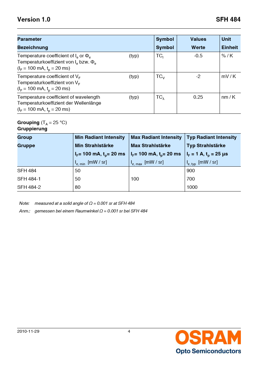 Version 1.0 SFH 484 Parameter Symbol Values Unit Bezeichnung Werte Einheit Grouping Gruppierung Group