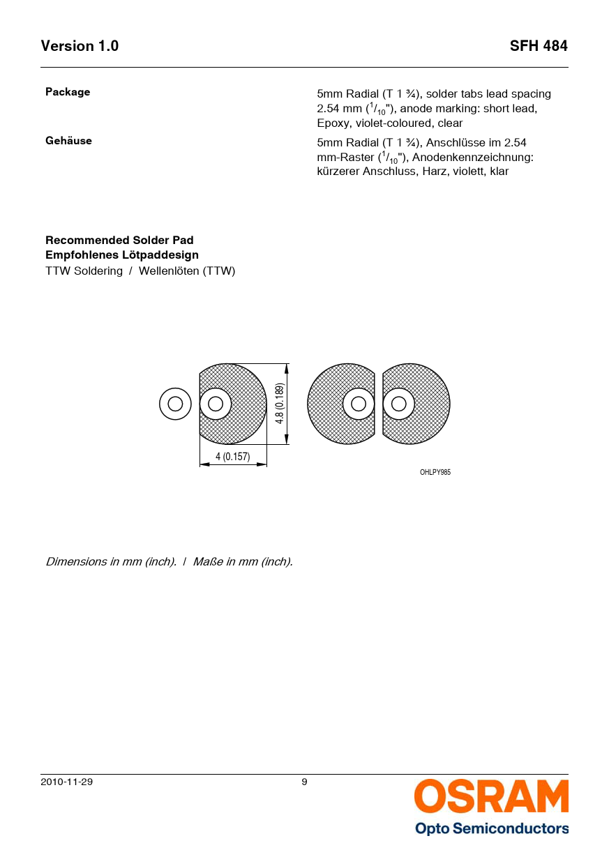 Version 1.0. SFH 484. Package. Gehäuse. Recommended Solder Pad. Empfohlenes Lötpaddesign