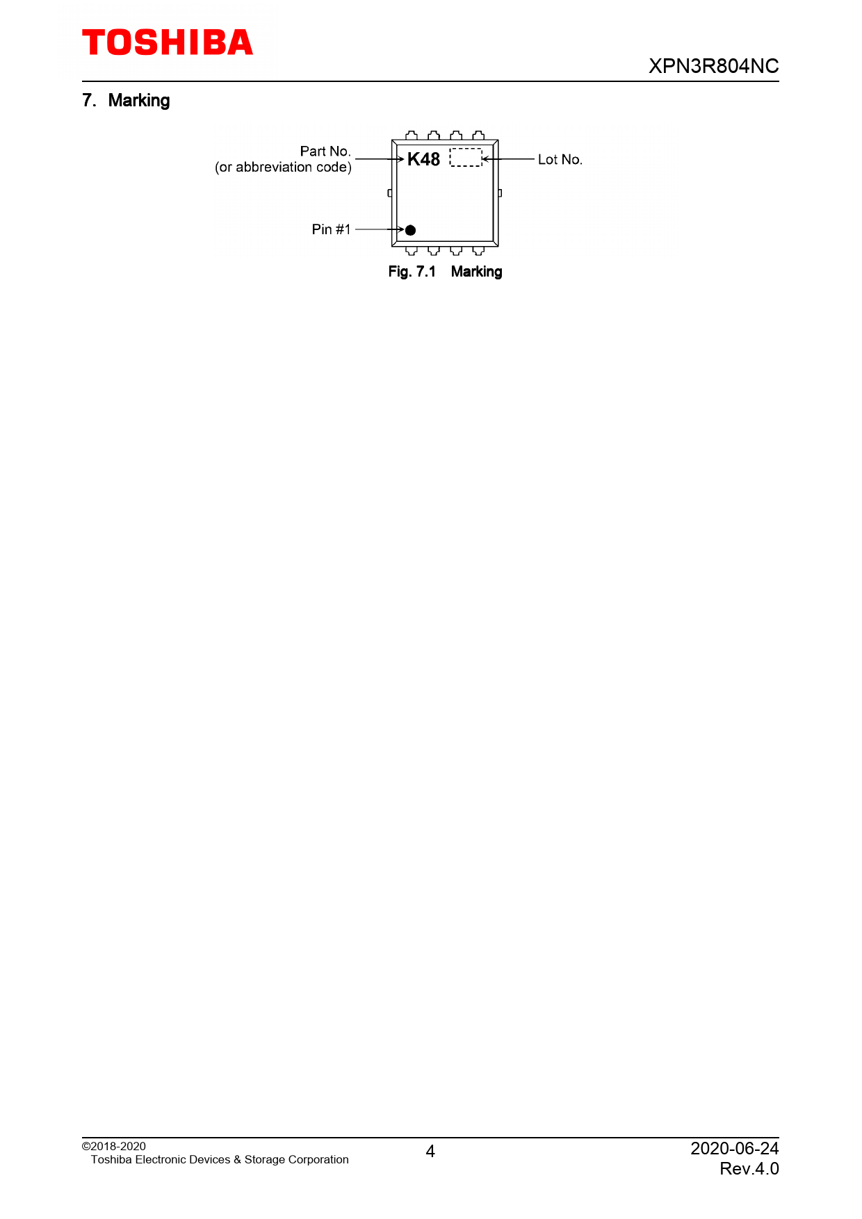 XPN3R804NC. 7. Marking. Fig. 7.1. Marking. ©2018-2020. 4. 2020-06-24. Toshiba. Electronic. Devices. &. Storage. Corporation. Rev.4.0