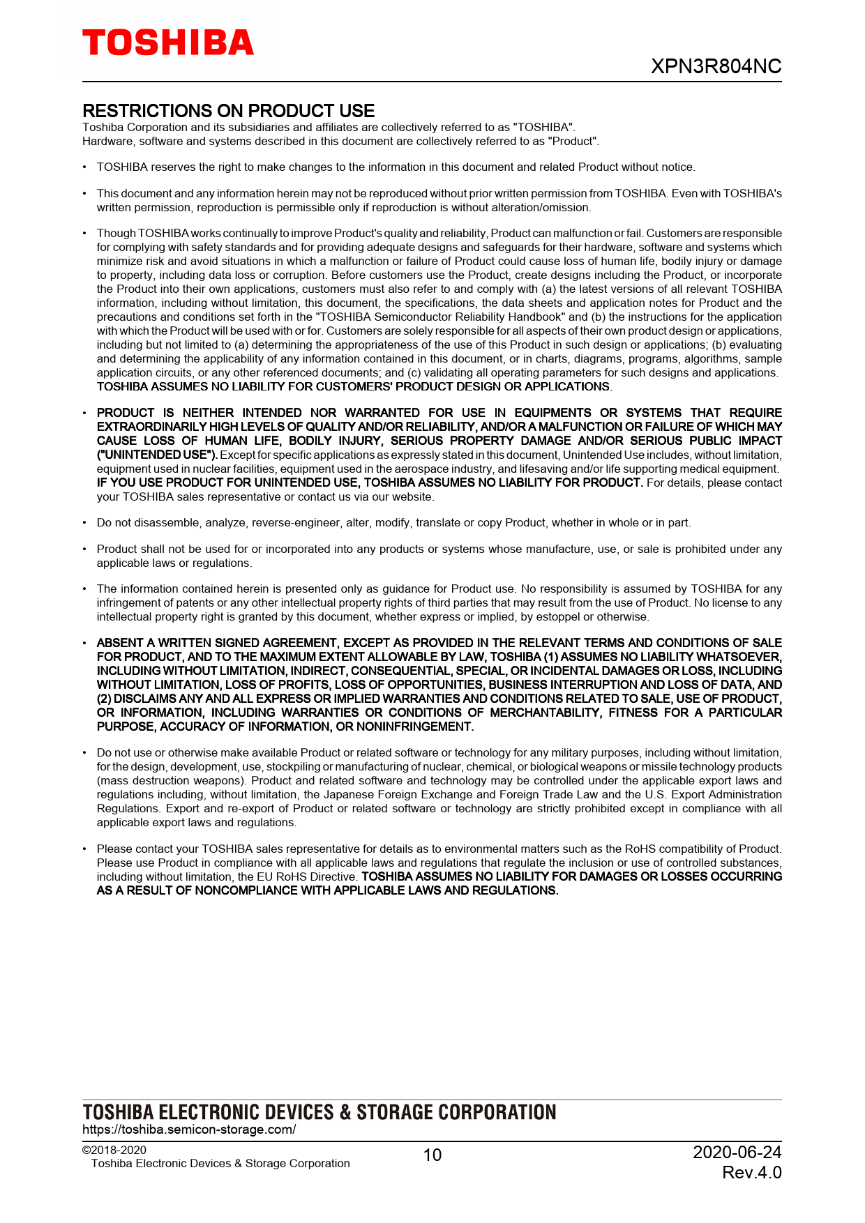XPN3R804NC RESTRICTIONS ON PRODUCT USE Toshiba Corporation and its subsidiaries and affiliates are collectively referred to as "TOSHIBA". Hardware, software and systems described in this document are collectively referred to as "Product". • TOSHIBA reserves the right to make changes to the information in this document and related Product without notice. • This document and any information herein may not be reproduced without prior written permission from TOSHIBA. Even with TOSHIBA's written permission, reproduction is permissible only if reproduction is without alteration/omission. • Though TOSHIBA works continually to improve Product's quality and reliability, Product can malfunction or fail. Customers are responsible for complying with safety standards and for providing adequate designs and safeguards for their hardware, software and systems which minimize risk and avoid situations in which a malfunction or failure of Product could cause loss of human life, bodily injury or damage to property, including data loss or corruption. Before customers use the Product, create designs including the Product, or incorporate the Product into their own applications, customers must also refer to and comply with (a) the latest versions of all relevant TOSHIBA information, including without limitation, this document, the specifications, the data sheets and application notes for Product and the precautions and conditions set forth in the "TOSHIBA Semiconductor Reliability Handbook" and (b) the instructions for the application with which the Product will be used with or for. Customers are solely responsible for all aspects of their own product design or applications, including but not limited to (a) determining the appropriateness of the use of this Product in such design or applications; (b) evaluating and determining the applicability of any information contained in this document, or in charts, diagrams, programs, algorithms, sample application circuits, or any other referenced documents; and (c) validating all operating parameters for such designs and applications. TOSHIBA ASSUMES NO LIABILITY FOR CUSTOMERS' PRODUCT DESIGN OR APPLICATIONS. • PRODUCT IS NEITHER INTENDED NOR WARRANTED FOR USE IN EQUIPMENTS OR SYSTEMS THAT REQUIRE EXTRAORDINARILY HIGH EXTRAORDINARILY LEVELS HIGH OF LEVELS QUALITY OF AND/OR QUALITY RELIABILITY, AND/OR AND/OR RELIABILITY, A AND/OR MALFUNCTION A OR MALFUNCTION FAILURE OR OF FAILURE WHICH OF MAY WHICH CAUSE LOSS OF HUMAN LIFE, BODILY INJURY, SERIOUS PROPERTY DAMAGE AND/OR SERIOUS PUBLIC IMPACT ("UNINTENDED USE"). ("UNINTENDED Except for specific applications as expressly stated in this document, Unintended Use includes, without limitation, equipment used in nuclear facilities, equipment used in the aerospace industry, and lifesaving and/or life supporting medical equipment. IF YOU IF USE YOU PRODUCT USE FOR PRODUCT UNINTENDED FOR USE, UNINTENDED TOSHIBA USE, ASSUMES TOSHIBA NO ASSUMES LIABILITY NO FOR LIABILITY PRODUCT. FOR For details, please contact your TOSHIBA sales representative or contact us via our website. • Do not disassemble, analyze, reverse-engineer, alter, modify, translate or copy Product, whether in whole or in part. • Product shall not be used for or incorporated into any products or systems whose manufacture, use, or sale is prohibited under any applicable laws or regulations. • The information contained herein is presented only as guidance for Product use. No responsibility is assumed by TOSHIBA for any infringement of patents or any other intellectual property rights of third parties that may result from the use of Product. No license to any intellectual property right is granted by this document, whether express or implied, by estoppel or otherwise. • ABSENT A ABSENT WRITTEN A SIGNED WRITTEN AGREEMENT, SIGNED EXCEPT AGREEMENT, AS EXCEPT PROVIDED AS IN PROVIDED THE IN RELEVANT THE TERMS RELEVANT AND TERMS CONDITIONS AND OF CONDITIONS SALE OF FOR PRODUCT, FOR AND PRODUCT, TO AND THE TO MAXIMUM THE EXTENT MAXIMUM ALLOWABLE EXTENT BY ALLOWABLE LAW, BY TOSHIBA LAW, (1) TOSHIBA ASSUMES (1) NO ASSUMES LIABILITY NO WHATSOEVER, LIABILITY INCLUDING WITHOUT INCLUDING LIMITATION, WITHOUT INDIRECT, LIMITATION, CONSEQUENTIAL, INDIRECT, SPECIAL, CONSEQUENTIAL, OR SPECIAL, INCIDENTAL OR DAMAGES INCIDENTAL OR DAMAGES LOSS, OR INCLUDING LOSS, WITHOUT LIMITATION, WITHOUT LOSS LIMITATION, OF LOSS PROFITS, OF LOSS PROFITS, OF LOSS OPPORTUNITIES, OF BUSINESS OPPORTUNITIES, INTERRUPTION BUSINESS AND INTERRUPTION LOSS AND OF LOSS DATA, OF AND DATA, (2) DISCLAIMS (2) ANY DISCLAIMS AND ANY ALL AND EXPRESS ALL OR EXPRESS IMPLIED OR WARRANTIES IMPLIED AND WARRANTIES CONDITIONS AND RELATED CONDITIONS TO RELATED SALE, TO USE SALE, OF USE PRODUCT, OF OR INFORMATION, INCLUDING WARRANTIES OR CONDITIONS OF MERCHANTABILITY, FITNESS FOR A PARTICULAR PURPOSE, ACCURACY OF INFORMATION, OR NONINFRINGEMENT. • Do not use or otherwise make available Product or related software or technology for any military purposes, including without limitation, for the design, development, use, stockpiling or manufacturing of nuclear, chemical, or biological weapons or missile technology products (mass destruction weapons). Product and related software and technology may be controlled under the applicable export laws and regulations including, without limitation, the Japanese Foreign Exchange and Foreign Trade Law and the U.S. Export Administration Regulations. Export and re-export of Product or related software or technology are strictly prohibited except in compliance with all applicable export laws and regulations. • Please contact your TOSHIBA sales representative for details as to environmental matters such as the RoHS compatibility of Product. Please use Product in compliance with all applicable laws and regulations that regulate the inclusion or use of controlled substances, including without limitation, the EU RoHS Directive. TOSHIBA ASSUMES TOSHIBA NO ASSUMES LIABILITY NO FOR LIABI