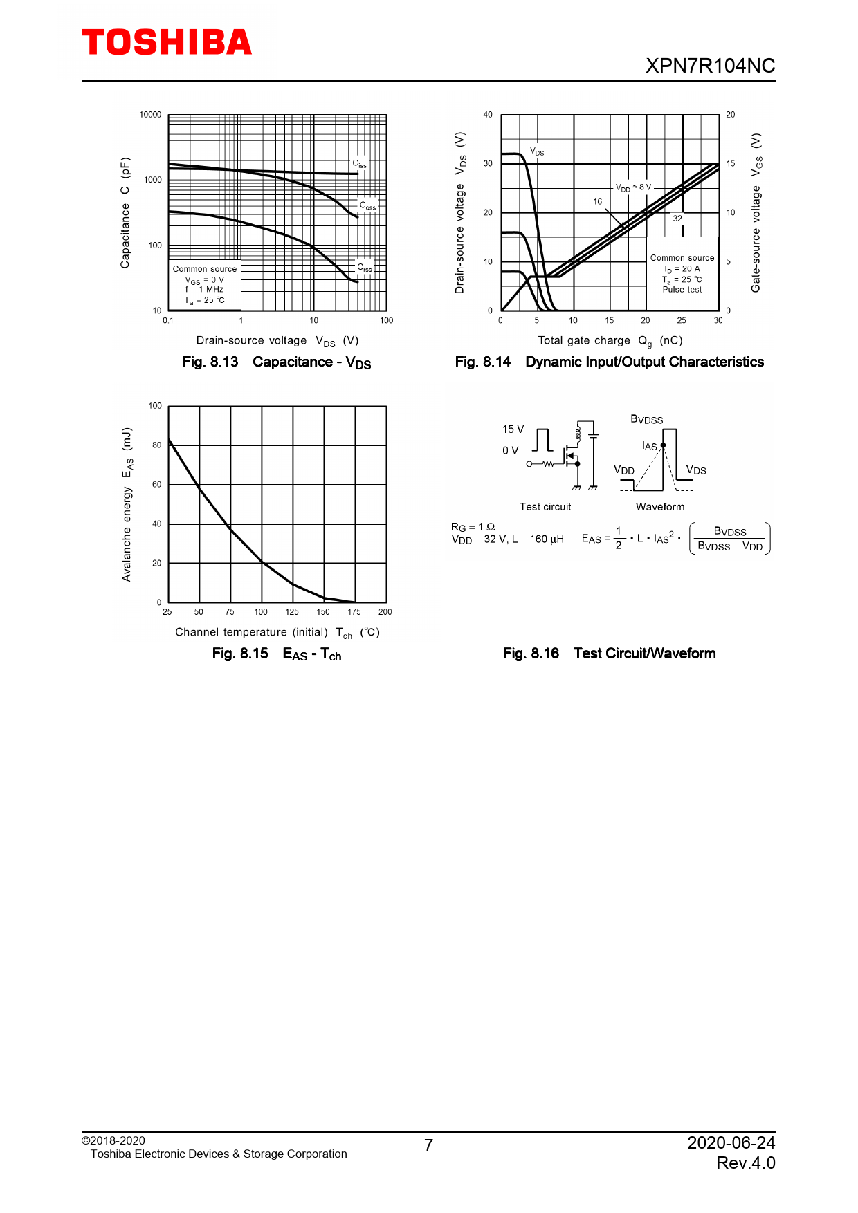 XPN7R104NC. Fig. 8.13. Capacitance. -. VDS. Fig. 8.14. Dynamic. Input/Output. Characteristics. Fig. 8.15. EAS. -. Tch. Fig. 8.16. Test. Circuit/Waveform