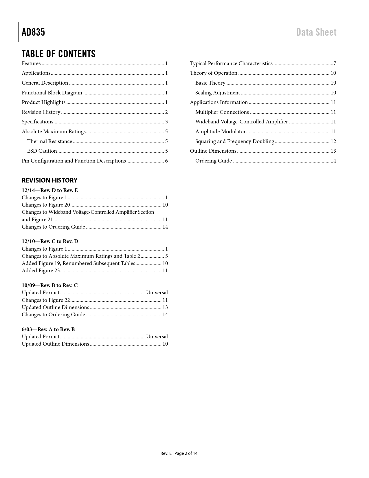 Pages / Page14 / 2 — AD835. Data Sheet. TABLE OF CONTENTS. REVISION HISTORY 12/14—Rev. D to …