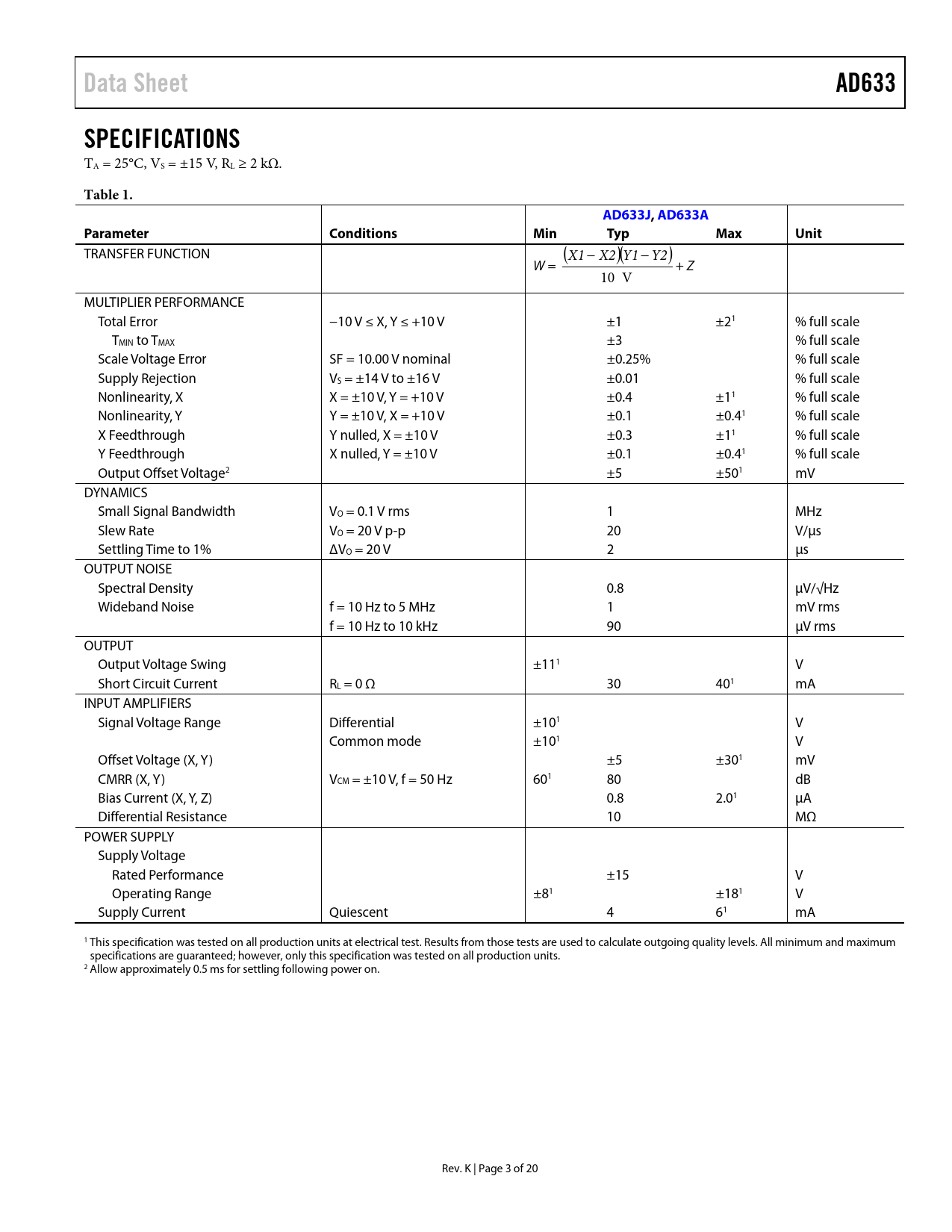 Pages / Page20 / 3 — Data Sheet. AD633. SPECIFICATIONS. Table 1. AD633J, AD633A. Parameter. …