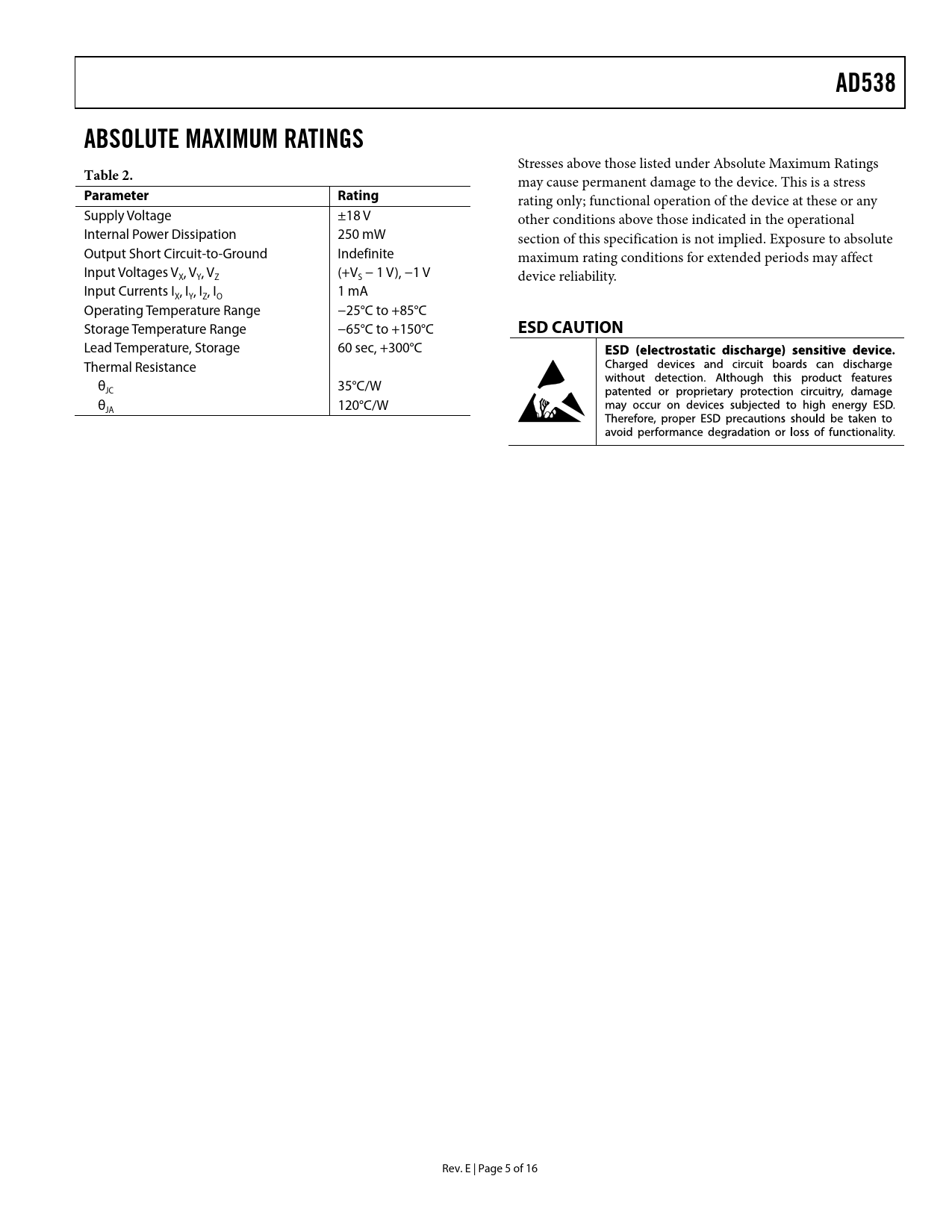 Pages / Page16 / 5 — AD538. ABSOLUTE MAXIMUM RATINGS. Table 2. Parameter. Rating. ESD CAUTION