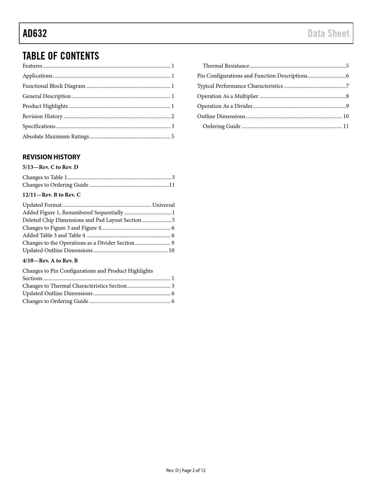 Pages / Page12 / 2 — AD632. Data Sheet. TABLE OF CONTENTS. REVISION HISTORY 5/13—Rev. C to …