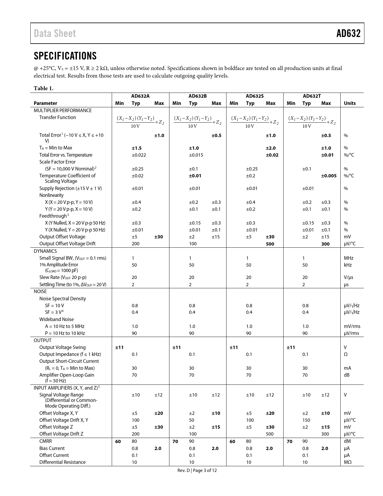 Pages / Page12 / 3 — Data Sheet. AD632. SPECIFICATIONS. Table 1. AD632A. AD632B. AD632S. …