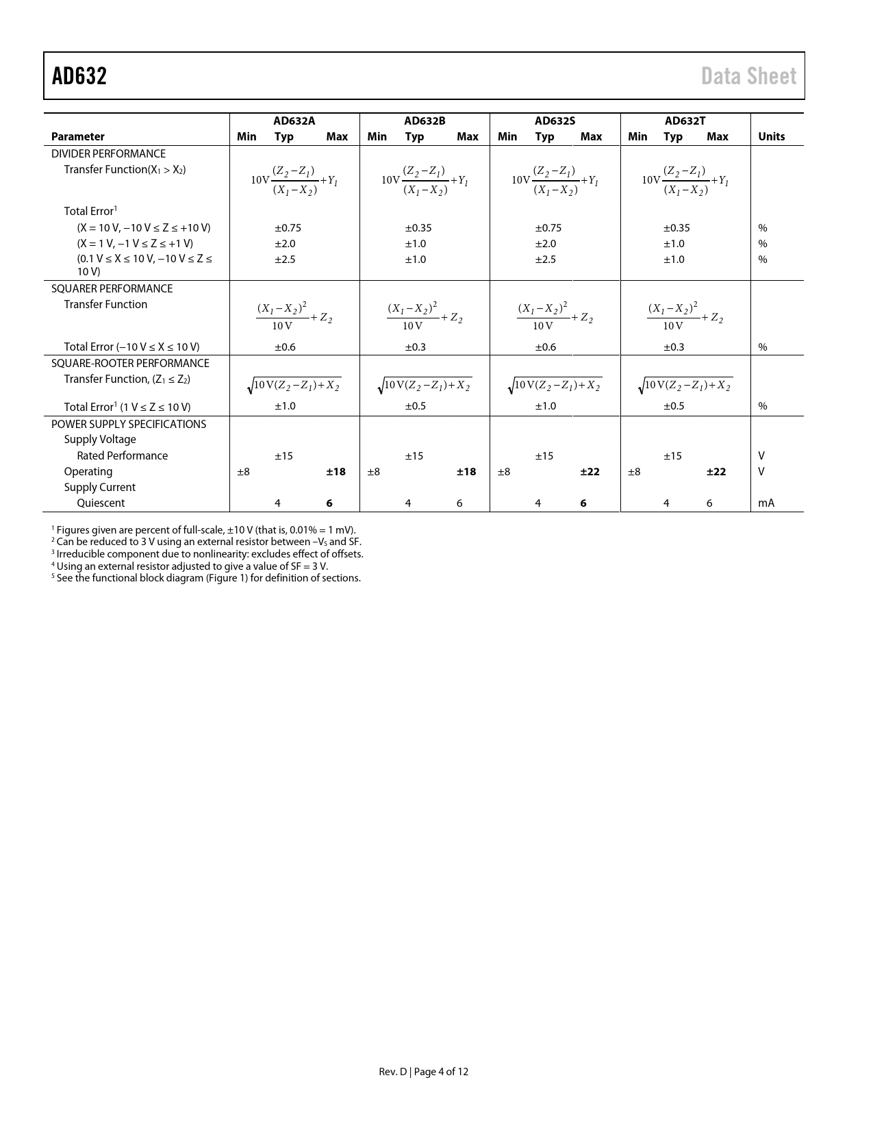 Pages / Page12 / 4 — AD632. Data Sheet. AD632A. AD632B. AD632S. AD632T. Parameter. Min. Typ. …