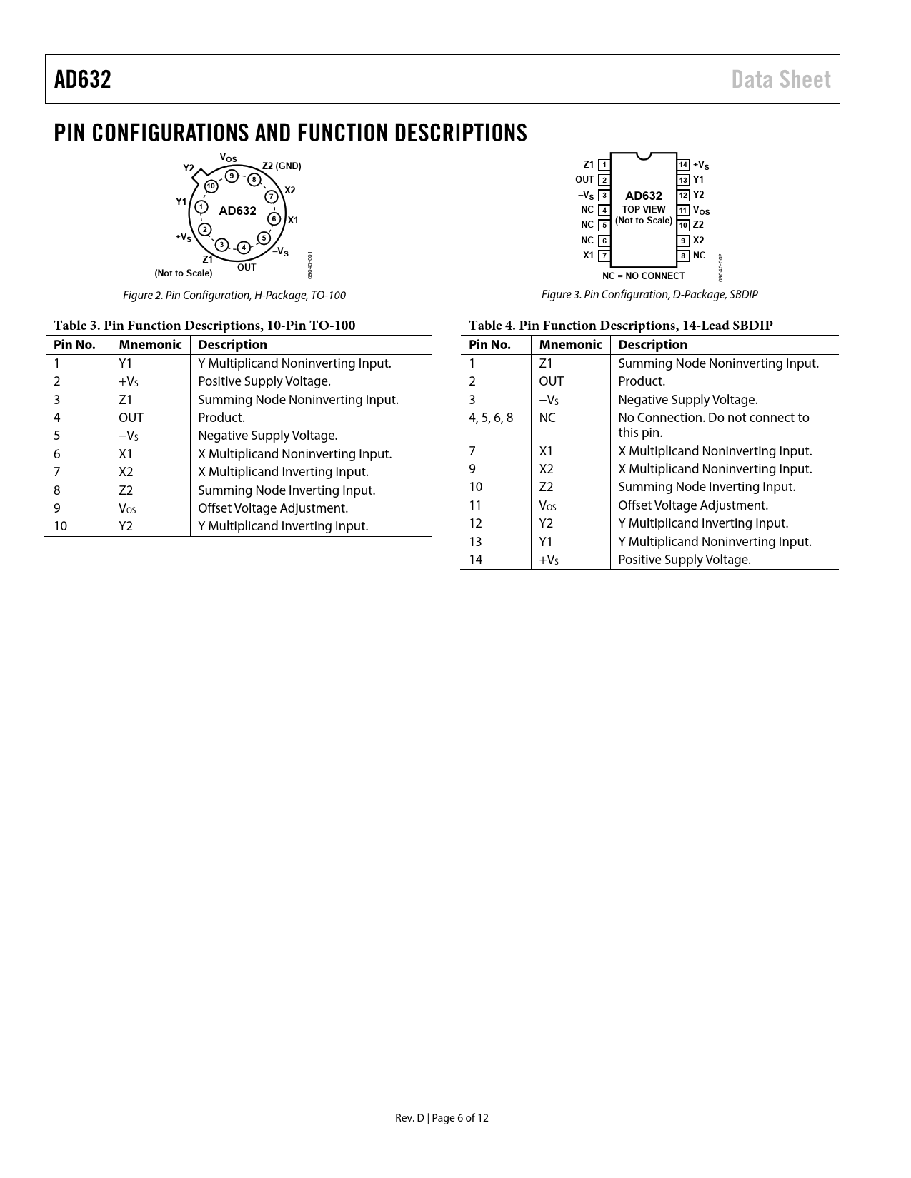 Table 3. Pin Function Descriptions, 10-Pin TO-100 Table 4. Pin Function Descriptions, 14-Lead SBDIP Pin No. Mnemonic Description Pin No. Mnemonic Description