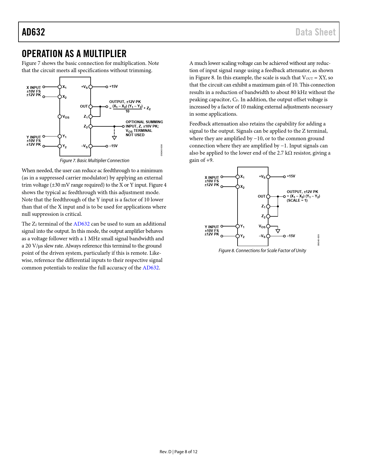 link to page 8 link to page 7 link to page 8 AD632Data SheetOPERATION AS A MULTIPLIER Figure 7 shows the basic connection for multiplication. Note A much lower scaling voltage can be achieved without any reduc- that the circuit meets all specifications without trimming. tion of input signal range using a feedback attenuator, as shown in Figure 8. In this example, the scale is such that VOUT = XY, so X+15V that the circuit can exhibit a maximum gain of 10. This connection X INPUT1+VS±10V FS results in a reduction of bandwidth to about 80 kHz without the ±12V PKX2 peaking capacitor, CF. In addition, the output offset voltage is OUTPUT, ±12V PKOUT(X1 – X2) (Y1 – Y2)=+ Z increased by a factor of 10 making external adjustments necessary 210 in some applications. VOSZ1OPTIONAL SUMMING Feedback attenuation also retains the capability for adding a Z2INPUT, Z, ±10V PK; VOS TERMINAL signal to the output. Signals can be applied to the Z terminal, YNOT USEDY INPUT1 where they are amplified by −10, or to the common ground ±10V FS±12V PKY 8 2–VS–15V 00 connection where they are amplified by −1. Input signals can 0- 04 09 also be applied to the lower end of the 2.7 kΩ resistor, giving a Figure 7. Basic Multiplier Connection gain of +9. When needed, the user can reduce ac feedthrough to a minimum (as in a suppressed carrier modulator) by applying an external X1+VS+15VX INPUT±10V FS trim voltage (±30 mV range required) to the X or Y input. Figure 4 ±12V PKX2 shows the typical ac feedthrough with this adjustment mode. OUTPUT, ±12V PKOUT= (X1 – X2) (Y1 – Y2) Note that the feedthrough of the Y input is a factor of 10 lower (SCALE = 1) than that of the X input and is to be used for applications where Z1 null suppression is critical. Z2 The Z2 terminal of the AD632 can be used to sum an additional YVY INPUT1OS signal into the output. In this mode, the output amplifier behaves ±10V FS±12V PKY 9 as a voltage follower with a 1 MHz small signal bandwidth and 2–VS–15V 00 0- 04 a 20 V/μs slew rate. Always reference this terminal to the ground 09 point of the driven system, particularly if this is remote. Like- Figure 8. Connections for Scale Factor of Unity wise, reference the differential inputs to their respective signal common potentials to realize the full accuracy of the AD632. Rev. D | Page 8 of 12 Document Outline Features Applications Functional Block Diagram General Description Product Highlights Revision History Specifications Absolute Maximum Ratings Thermal Resistance Pin Configurations and Function Descriptions Typical Performance Characteristics Operation As a Multiplier Operation As a Divider Outline Dimensions Ordering Guide