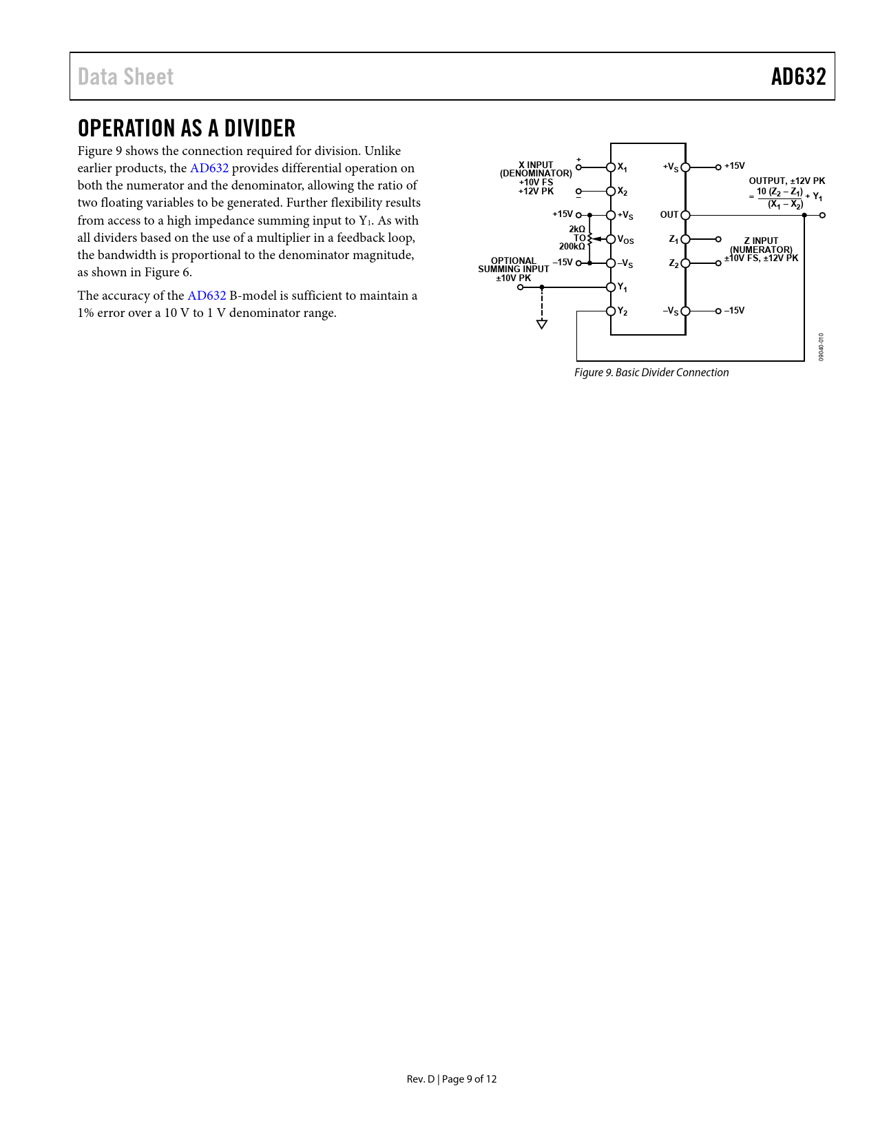 Data Sheet. AD632. OPERATION AS A DIVIDER. X INPUT. +VS. +15V. (DENOMINATOR). +10V FS. OUTPUT, ±12V PK. +12V PK. 10 (Z. 2 – Z1). + Y. (X1 – X2)