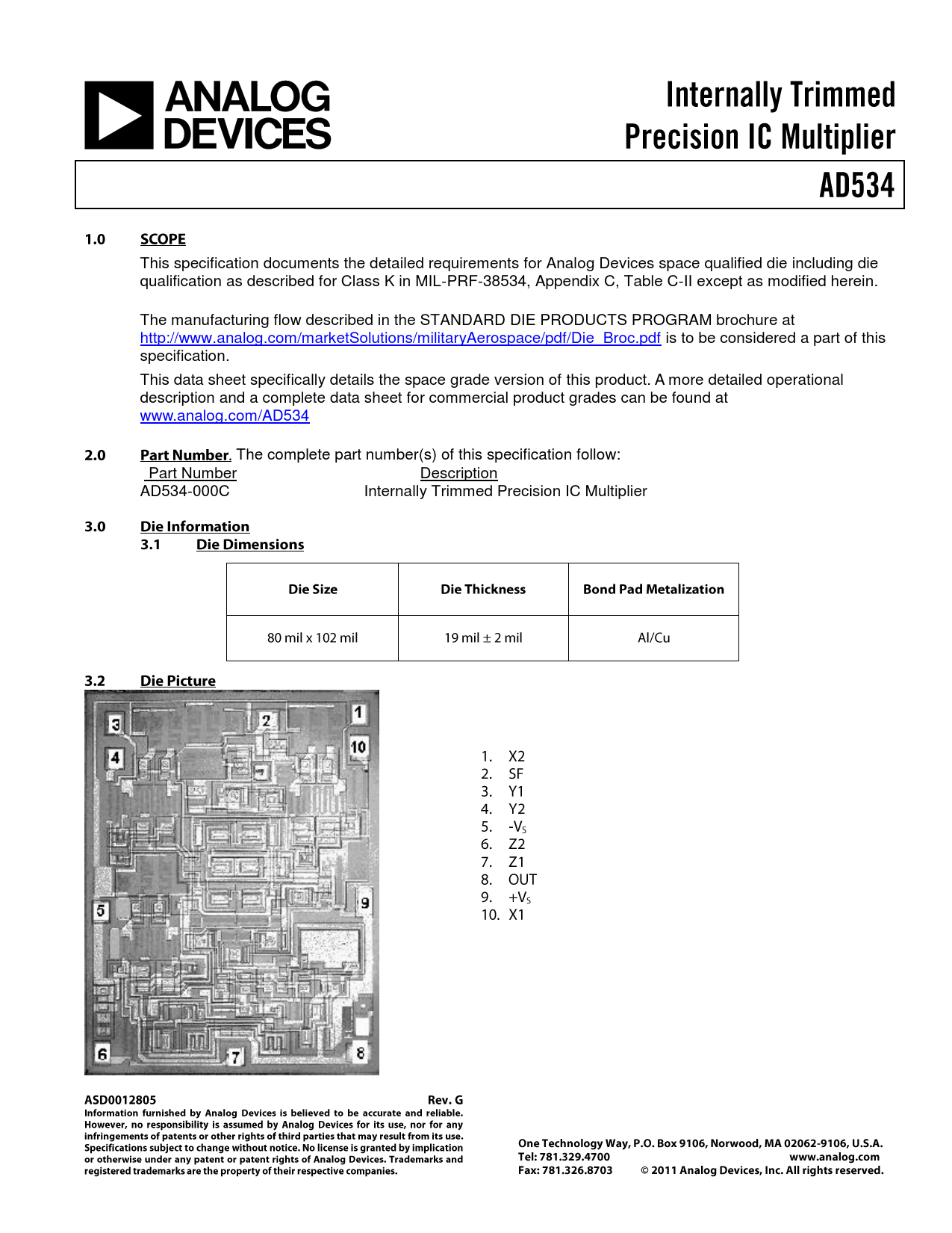This specification documents the detailed requirements for Analog Devices space qualified die including die qualification as described for Class K in MIL-PRF-38534, Appendix C, Table C-II except as modified herein. The manufacturing flow described in the STANDARD DIE PRODUCTS PROGRAM brochure at http://www.analog.com/marketSolutions/militaryAerospace/pdf/Die_Broc.pdf is to be considered a part of this specification. This data sheet specifically details the space grade version of this product. A more detailed operational description and a complete data sheet for commercial product grades can be found at www.analog.com/AD534 The complete part number(s) of this specification follow: Part Number Description AD534-000C Internally Trimmed Precision IC Multiplier