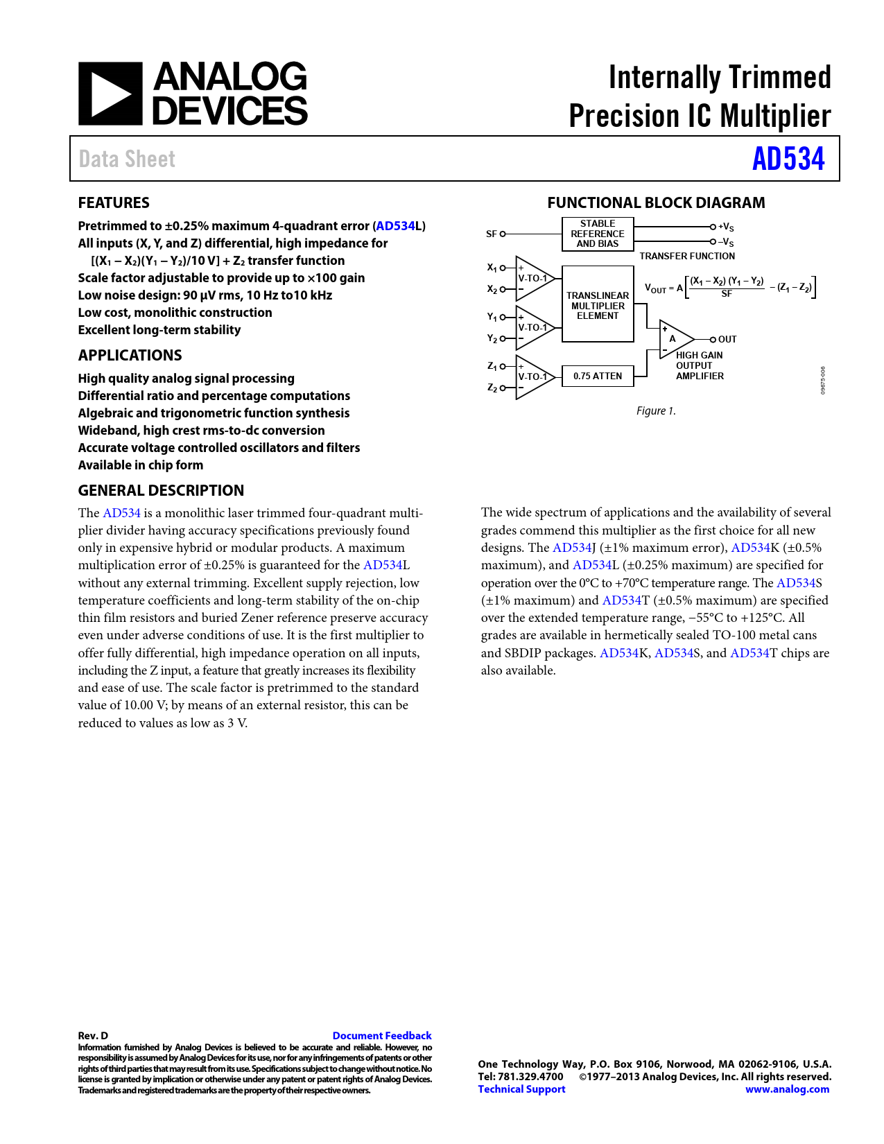 | Pages / Page | 20 / 1 — Internally Trimmed. Precision IC Multiplier. Data Sheet. AD534. FEATURES. … |