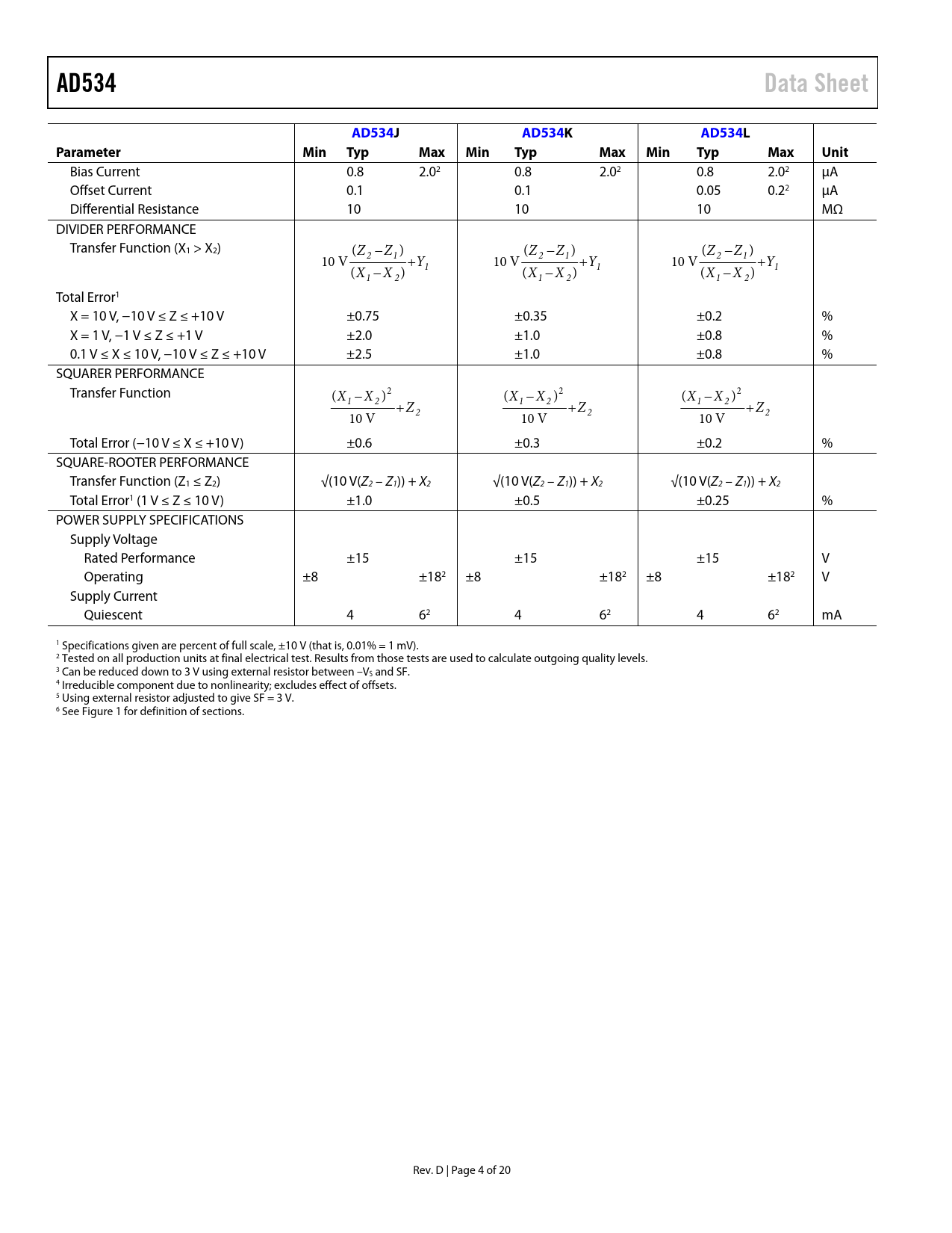 Pages / Page20 / 4 — AD534. Data Sheet. AD534J. AD534K. AD534L. Parameter. Min. Typ. Max. Unit