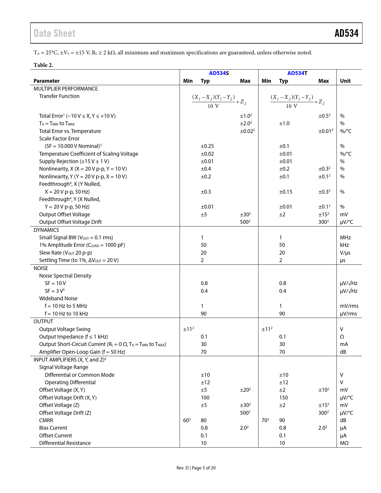 Data Sheet AD534 Table 2 AD534S AD534T Parameter Min Typ Max Unit