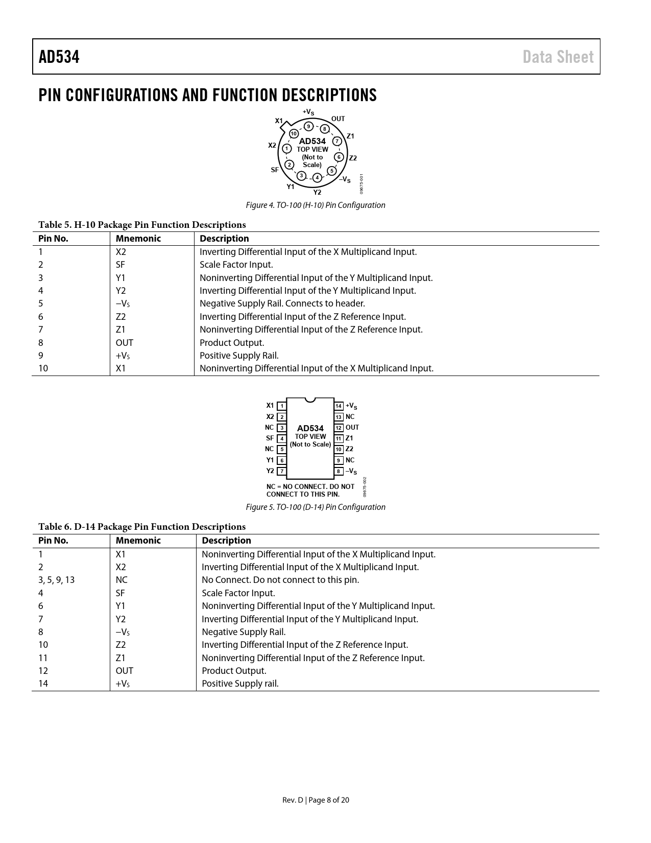 Pages / Page20 / 8 — AD534. Data Sheet. PIN CONFIGURATIONS AND FUNCTION DESCRIPTIONS. +VS. …