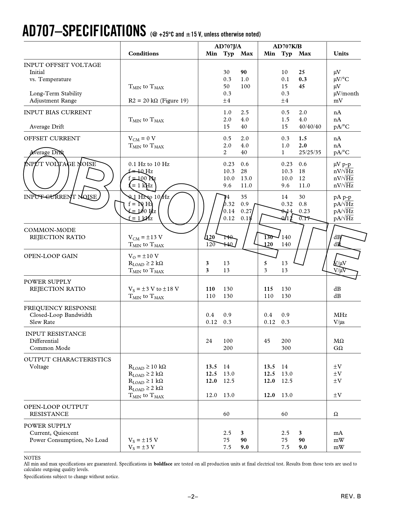 AD707–SPECIFICATIONS (@ +25. C and. 15 V, unless otherwise noted). AD707J/A. AD707K/B. Conditions. Min. Typ. Max. Units. 0.3. 1.5. 2.0. OBSOLETE