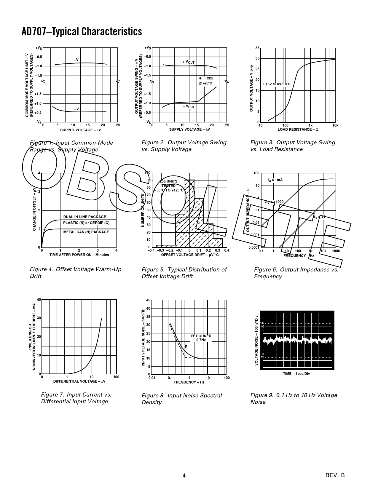 AD707–Typical Characteristics+V+VSS35–0.5–0.530+V+ V ± VOUT–1.0–1.025–1.5–1.5RL = 2k Ω 20@ +25 ° C ± 15V SUPPLIES15+1.5+1.510+1.0+1.0– VOUT–VOUTPUT VOLTAGE – V p -p+0.5OUTPUT VOLTAGE SWING –+0.55COMMOM-MODE VOLTAGE LIMIT – V(REFERRED TO SUPPLY VOLTAGES)(REFERRED TO SUPPLY VOLTAGES)–V–VSS005101520250510152025101001k10kSUPPLY VOLTAGE – ± VSUPPLY VOLTAGE – ± VLOAD RESISTANCE – Ω Figure 1. Input Common-Mode Figure 2. Output Voltage Swing Figure 3. Output Voltage Swing Range vs. Supply Voltage vs. Supply Voltage vs. Load Resistance OBSOLETE410010090256 UNITSIO = 1mATESTED1080 – 55 ° C TO +125 ° C Ω 370160AV = +10002500.1DUAL-IN-LINE PACKAGE40AV = +1PLASTIC (N) or CERDIP (Q)0.01NUMBER OF UNITS 30CHANGE IN OFFSET – µV 1METAL CAN (H) PACKAGE20OUTPUT IMPEDANCE –0.00110000.000101234–0.4 –0.3 –0.2 –0.100.10.20.30.40.11101001k10k100kTIME AFTER POWER ON – MinutesOFFSET VOLTAGE DRIFT – µV/ ° CFREQUENCY – Hz Figure 4. Offset Voltage Warm-Up Figure 5. Typical Distribution of Figure 6. Output Impedance vs. Drift Offset Voltage Drift Frequency 404540 √ Hz 3530100309025I/F CORNER200.7Hz20INVERTING OR151010100%INPUT VOLTAGE NOISE – nV/VOLTAGE NOISE – 100nV/Div5NONINVERTING INPUT CURRENT – mA00TIME – 1sec/Div01101000.010.1110100DIFFERENTIAL VOLTAGE – ± VFREQUENCY – Hz Figure 7. Input Current vs. Figure 8. Input Noise Spectral Figure 9. 0.1 Hz to 10 Hz Voltage Differential Input Voltage Density Noise –4– REV. B