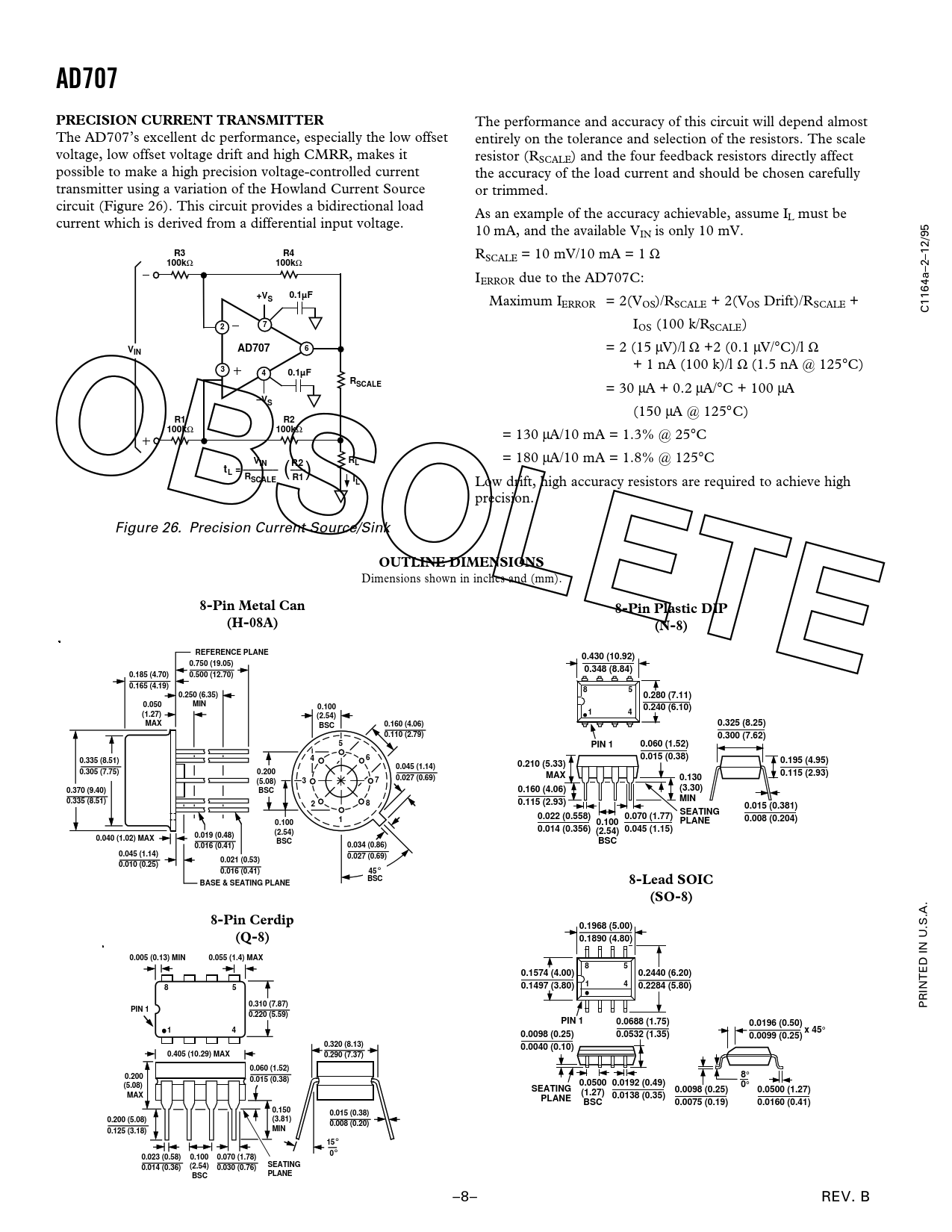 AD707PRECISION CURRENT TRANSMITTER The performance and accuracy of this circuit will depend almost The AD707’s excellent dc performance, especially the low offset entirely on the tolerance and selection of the resistors. The scale voltage, low offset voltage drift and high CMRR, makes it resistor (RSCALE) and the four feedback resistors directly affect possible to make a high precision voltage-controlled current the accuracy of the load current and should be chosen carefully transmitter using a variation of the Howland Current Source or trimmed. circuit (Figure 26). This circuit provides a bidirectional load As an example of the accuracy achievable, assume I current which is derived from a differential input voltage. L must be 10 mA, and the available VIN is only 10 mV. R3R4 RSCALE = 10 mV/10 mA = 1 Ω 100k Ω 100k Ω IERROR due to the AD707C: +V0.1µFS Maximum IERROR = 2(VOS)/RSCALE + 2(VOS Drift)/RSCALE + C1164a–2–12/95 27 IOS (100 k/RSCALE) VAD7076 = 2 (15 µV)/l Ω +2 (0.1 µV/°C)/l Ω IN + 1 nA (100 k)/l Ω (1.5 nA @ 125°C) 340.1µFRSCALE = 30 µA + 0.2 µA/°C + 100 µA –VS (150 µA @ 125°C) OBSOLETER1R2100k Ω 100k Ω = 130 µA/10 mA = 1.3% @ 25°C VR = 180 µA/10 mA = 1.8% @ 125°C INR2LtL = ––––––– ––– ( ) RSCALER1IL Low drift, high accuracy resistors are required to achieve high precision. Figure 26. Precision Current Source/Sink OUTLINE DIMENSIONS Dimensions shown in inches and (mm). 8-Pin Metal Can8-Pin Plastic DIP(H-08A)(N-8)REFERENCE PLANE0.430 (10.92)0.750 (19.05)0.348 (8.84)0.185 (4.70)0.500 (12.70)0.165 (4.19)850.250 (6.35)0.280 (7.11)0.050MIN0.1000.240 (6.10)(1.27)14(2.54)MAXBSC0.160 (4.06)0.325 (8.25)0.110 (2.79)0.300 (7.62)5PIN 10.060 (1.52)460.015 (0.38)0.335 (8.51)0.195 (4.95)0.045 (1.14)0.210 (5.33)0.305 (7.75)0.2000.115 (2.93)0.027 (0.69)MAX0.130(5.08)370.370 (9.40)BSC0.160 (4.06)(3.30)0.335 (8.51)MIN280.115 (2.93)0.015 (0.381)SEATING0.022 (0.558)0.070 (1.77)0.008 (0.204)0.10010.100PLANE0.014 (0.356)0.045 (1.15)(2.54)(2.54)0.040 (1.02) MAX0.019 (0.48)BSCBSC0.016 (0.41)0.034 (0.86)0.045 (1.14)0.027 (0.69)0.021 (0.53)0.010 (0.25)0.016 (0.41)45 ° BSC8-Lead SOICBASE & SEATING PLANE(SO-8)8-Pin Cerdip0.1968 (5.00)(Q-8)0.1890 (4.80)0.005 (0.13) MIN0.055 (1.4) MAX850.1574 (4.00)0.2440 (6.20)14850.1497 (3.80)0.2284 (5.80)0.310 (7.87) PRINTED IN U.S.A. PIN 10.220 (5.59)PIN 10.0688 (1.75)0.0196 (0.50)14x 45 ° 0.0098 (0.25)0.0532 (1.35)0.0099 (0.25)0.320 (8.13)0.0040 (0.10)0.405 (10.29) MAX0.290 (7.37)0.060 (1.52)0.2008 ° 0.015 (0.38)(5.08)0.0500 0.0192 (0.49)0 ° SEATING0.0098 (0.25)0.0500 (1.27)MAX(1.27)PLANE0.0138 (0.35)BSC0.0075 (0.19)0.0160 (0.41)0.1500.015 (0.38)0.200 (5.08)(3.81)0.008 (0.20)MIN0.125 (3.18)15 ° 0 ° 0.023 (0.58)0.1000.070 (1.78)SEATING0.014 (0.36)(2.54)0.030 (0.76)PLANEBSC –8– REV. B