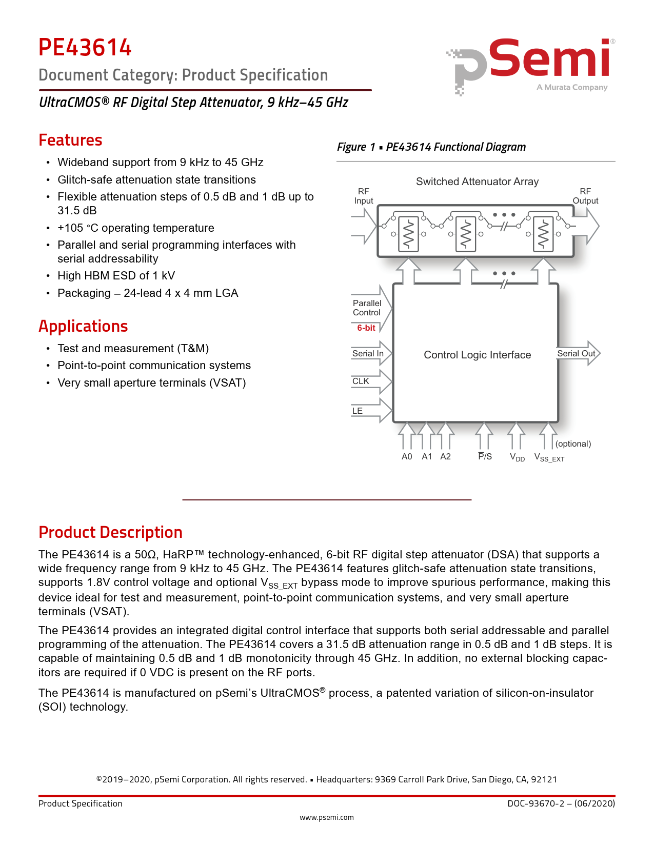 PE43614. Document Category:. Product Specification UltraCMOS® RF Digital Step Attenuator, 9 kHz–45 GHz. Features