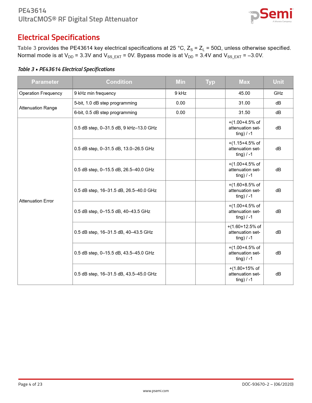 Pages / Page23 / 4 — PE43614. UltraCMOS® RF Digital Step Attenuator. Electrical Specifications …