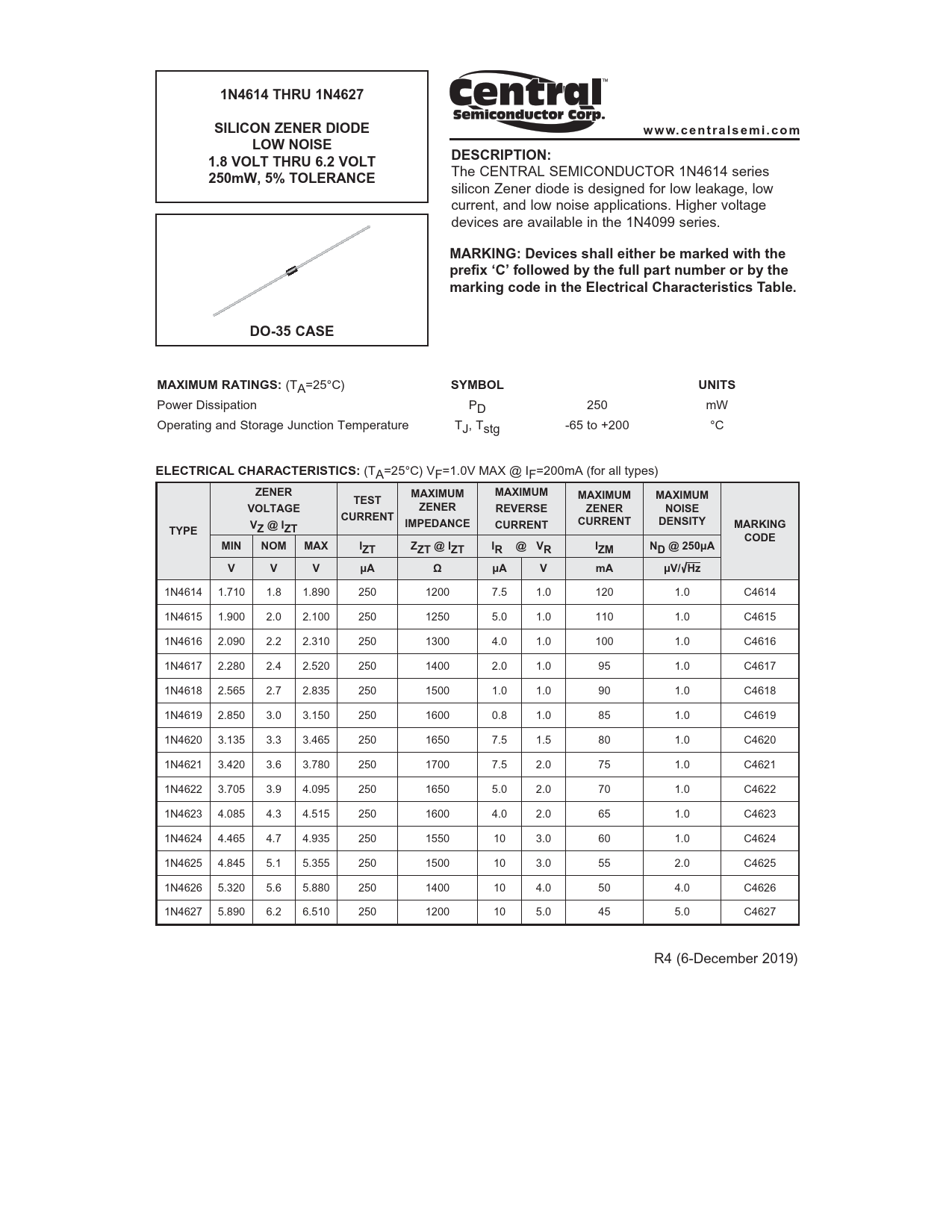 1N4614 THRU 1N4627. SILICON ZENER DIODE. w w w. c e n t r a l s e m i . c o m. LOW NOISE. DESCRIPTION:. 1.8 VOLT THRU 6.2 VOLT