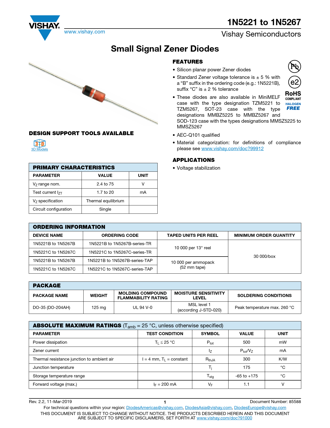1N5221 to 1N5267. Small Signal Zener Diodes. FEATURES. DESIGN SUPPORT TOOLS AVAILABLE. D 3. 3 D. APPLICATIONS