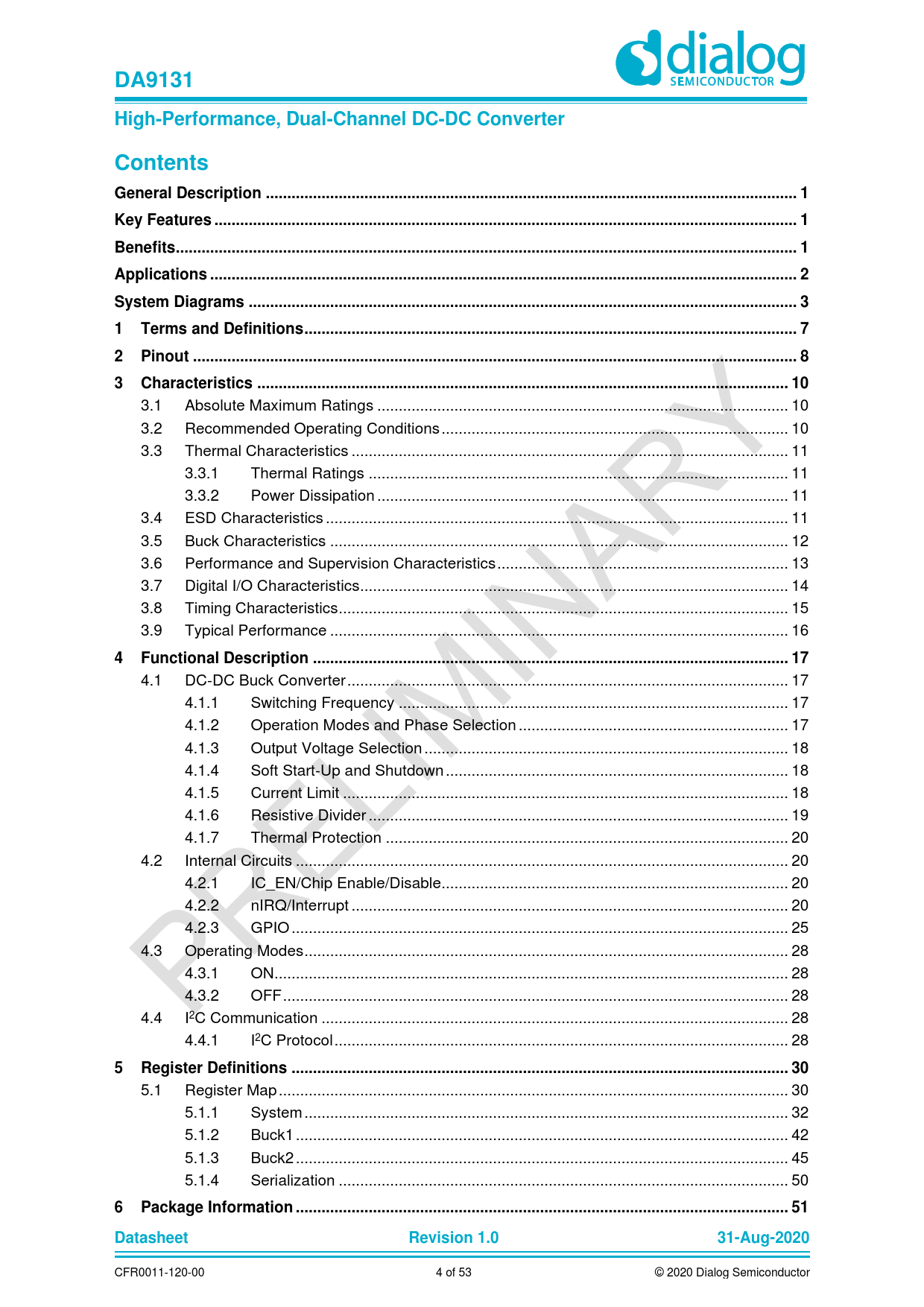 | Pages / Page | 53 / 4 — DA9131. High-Performance, Dual-Channel DC-DC Converter. Contents. General … |