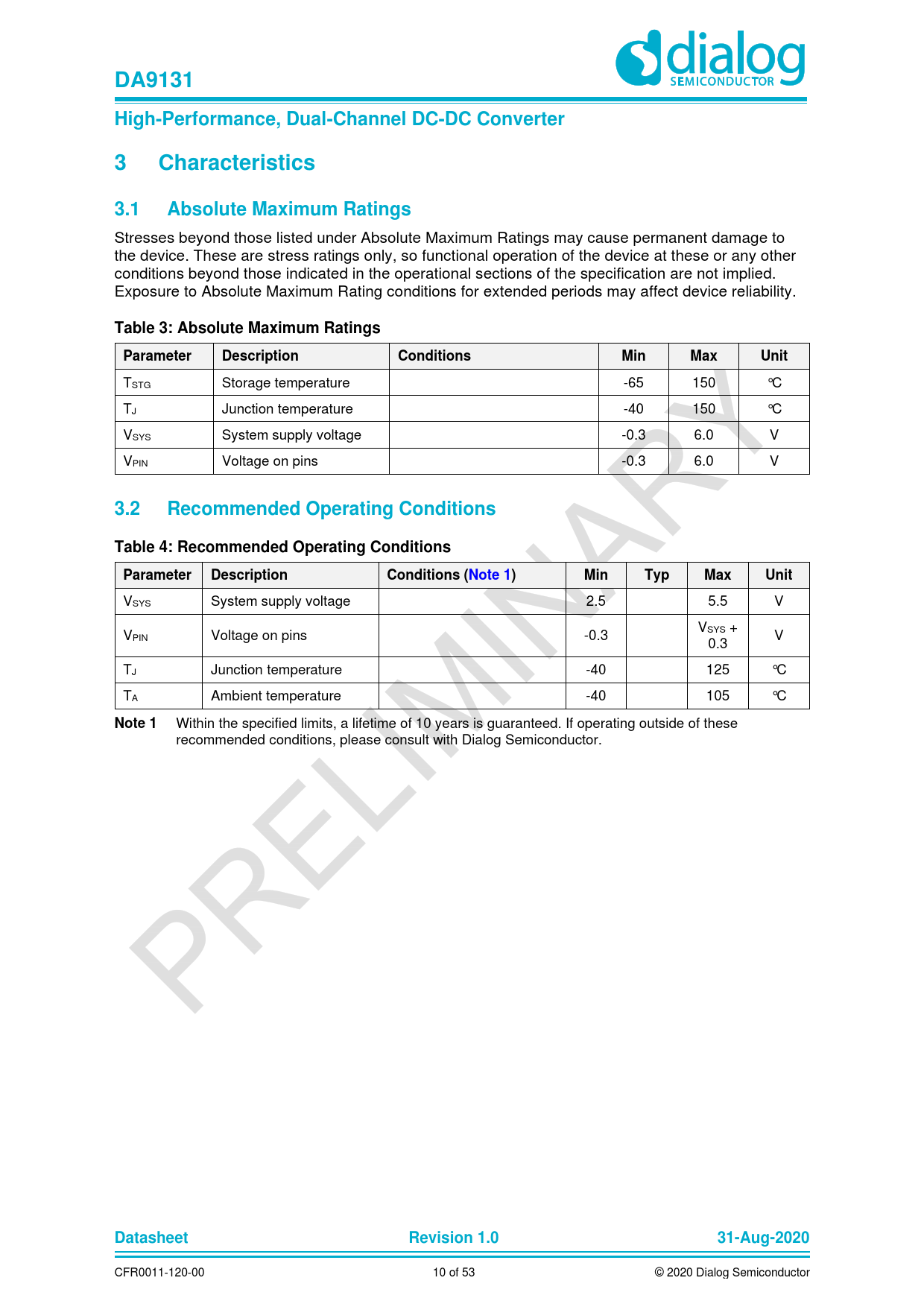 DA9131. High-Performance, Dual-Channel DC-DC Converter. Characteristics. 3.1. Absolute Maximum Ratings