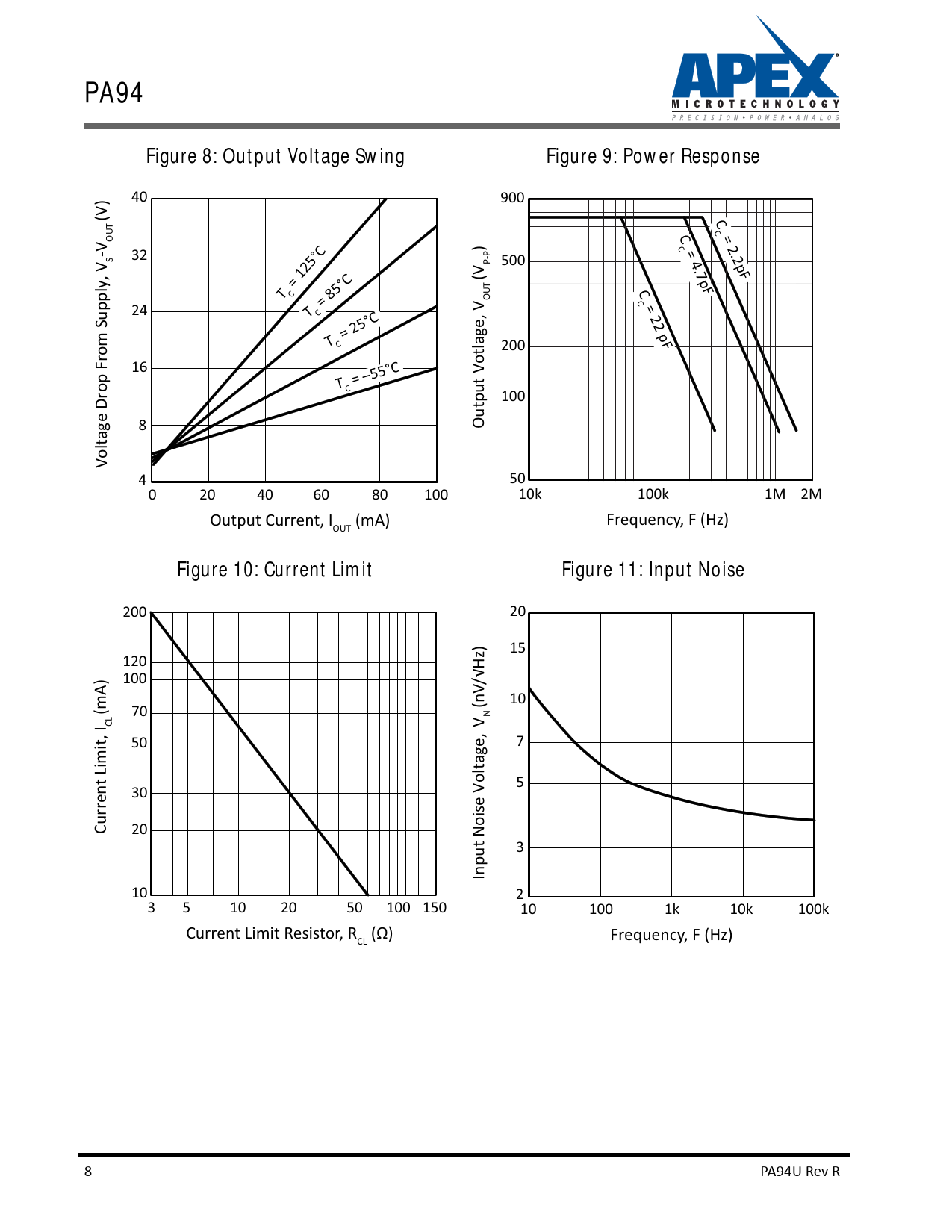 PA94. Figure 8: Output Voltage Swing. Figure 9: Power Response. Figure 10: Current Limit. Figure 11: Input Noise