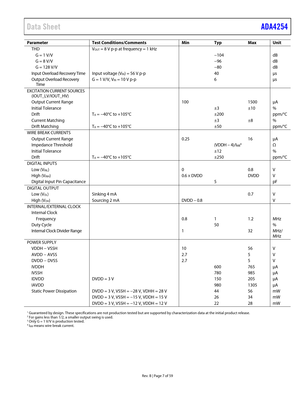 Pages / Page59 / 7 — Data Sheet. ADA4254. Parameter Test. Conditions/Comments. Min. Typ. Max. …