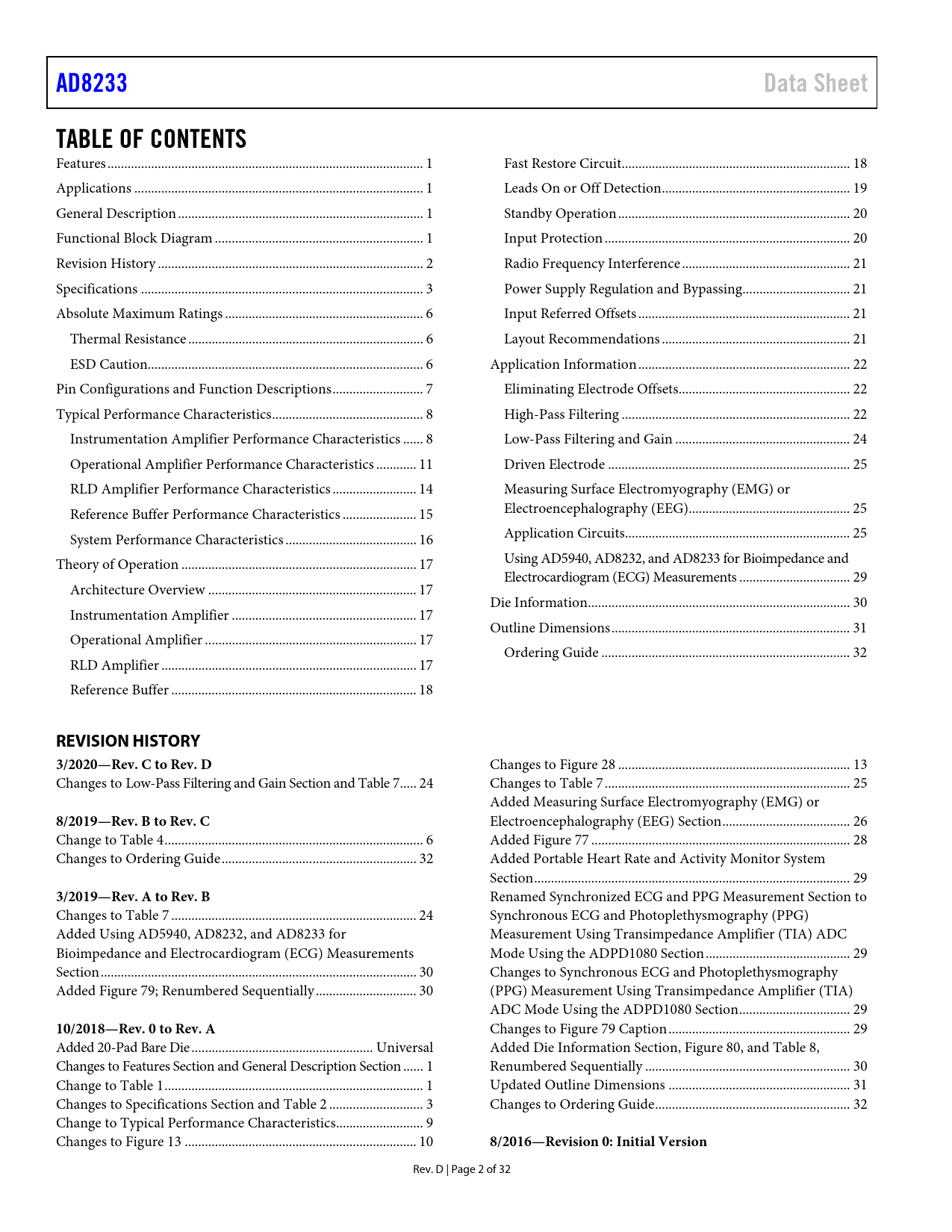 Pages / Page32 / 2 — AD8233. Data Sheet. TABLE OF CONTENTS. REVISION HISTORY. 3/2020—Rev. C to …