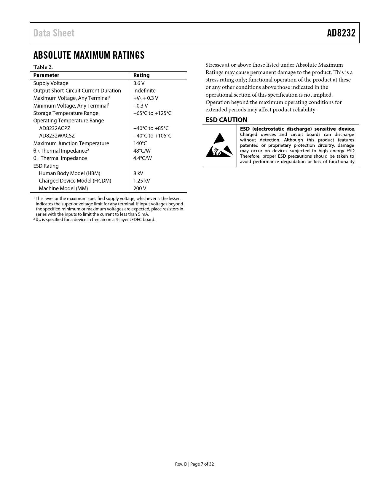 Pages / Page32 / 7 — Data Sheet. AD8232. ABSOLUTE MAXIMUM RATINGS Table 2. Parameter. Rating. …