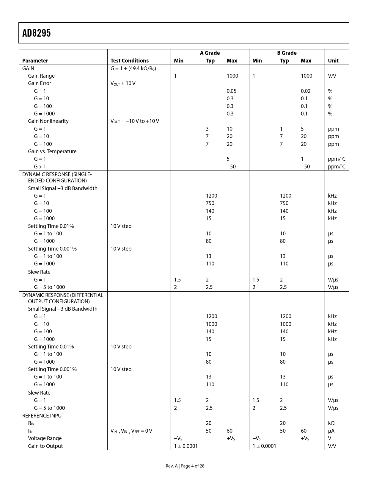 AD8295 A Grade B Grade Parameter Test Conditions Min Typ Max Min Typ Max Unit