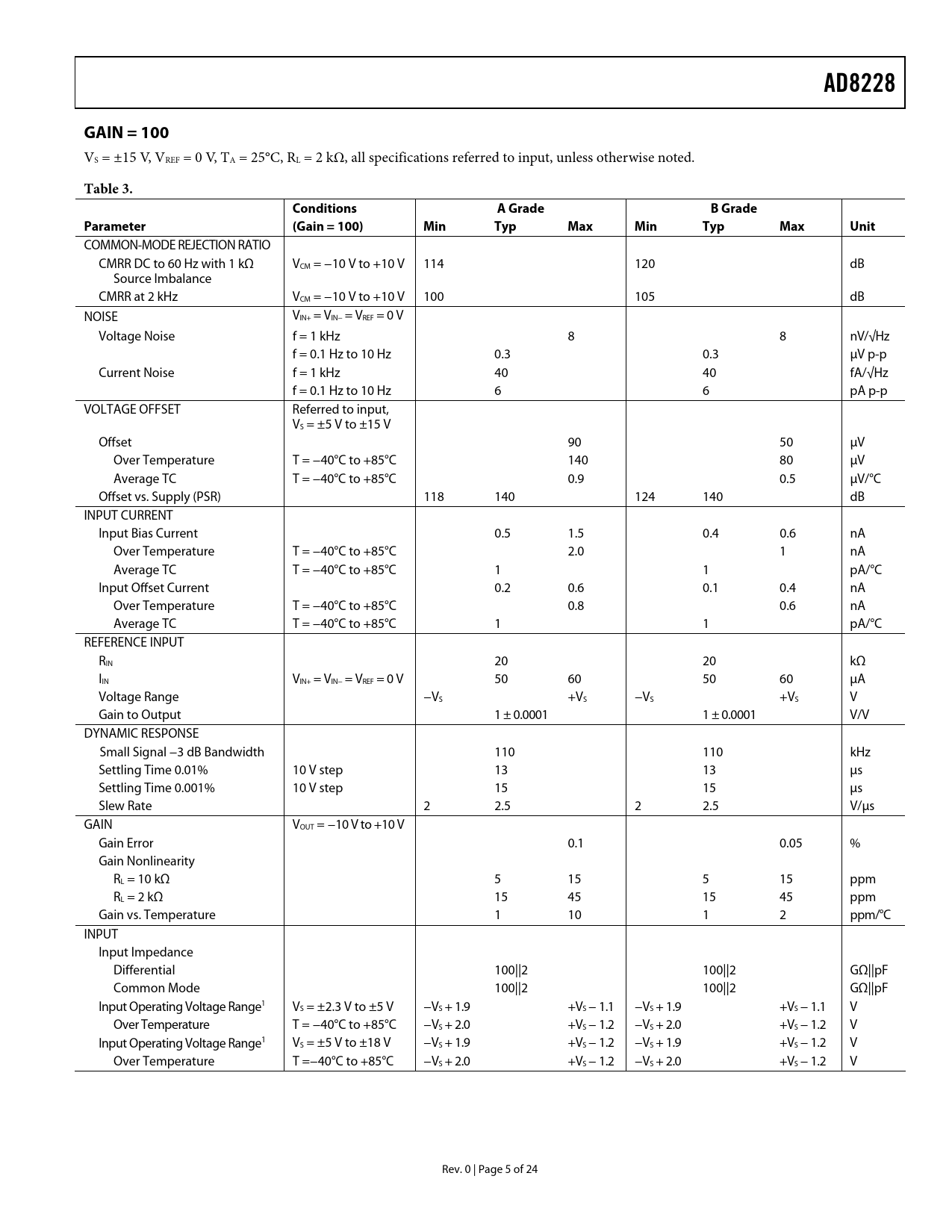 Pages / Page24 / 5 — AD8228. GAIN = 100. Table 3. Conditions. A Grade. B Grade. Parameter. …