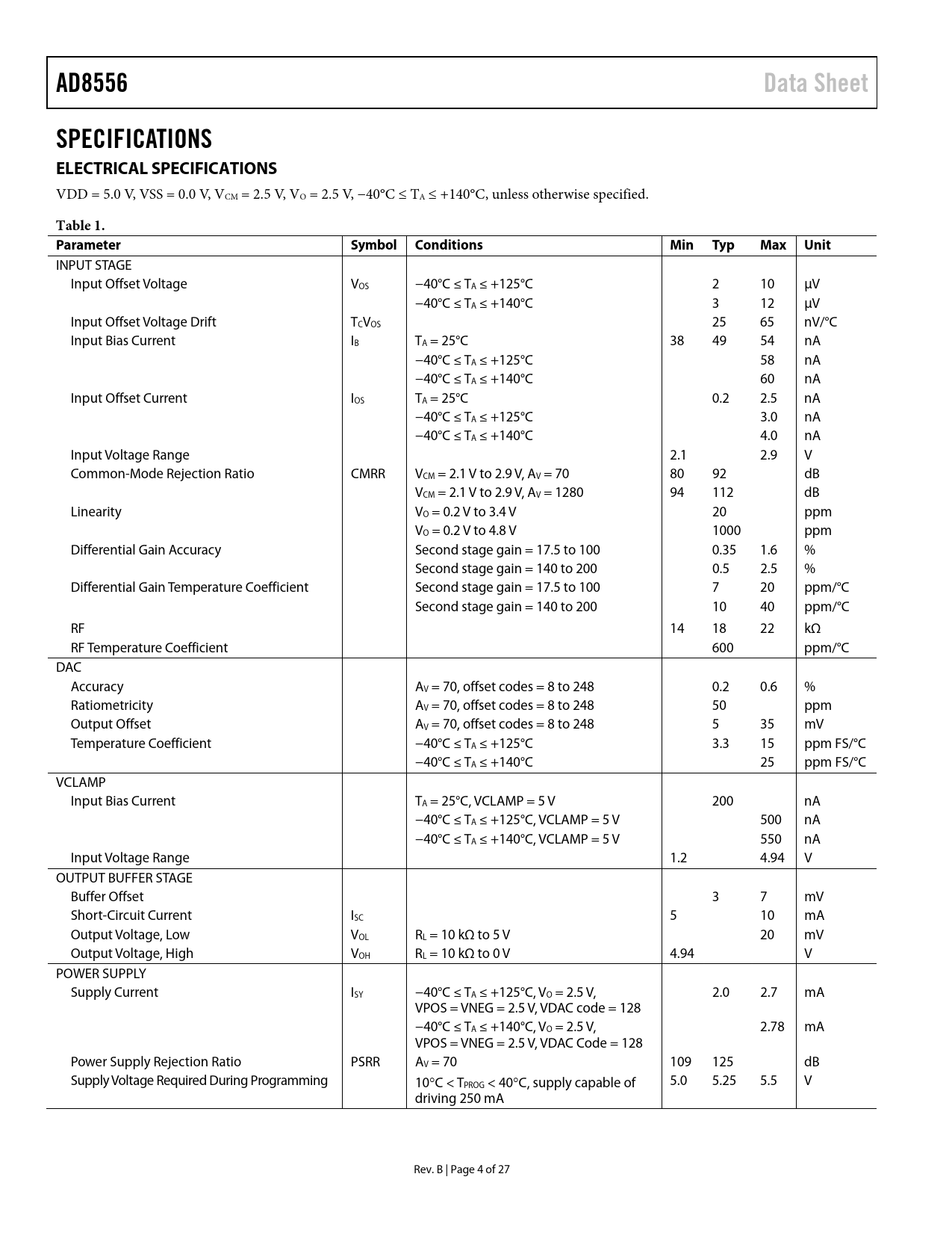 AD8556Data SheetSPECIFICATIONS ELECTRICAL SPECIFICATIONS VDD = 5.0 V, VSS = 0.0 V, VCM = 2.5 V, VO = 2.5 V, −40°C ≤ TA ≤ +140°C, unless otherwise specified. Table 1. ParameterSymbol ConditionsMin TypMax Unit INPUT STAGE Input Offset Voltage VOS −40°C ≤ TA ≤ +125°C 2 10 µV −40°C ≤ TA ≤ +140°C 3 12 µV Input Offset Voltage Drift TCVOS 25 65 nV/°C Input Bias Current IB TA = 25°C 38 49 54 nA −40°C ≤ TA ≤ +125°C 58 nA −40°C ≤ TA ≤ +140°C 60 nA Input Offset Current IOS TA = 25°C 0.2 2.5 nA −40°C ≤ TA ≤ +125°C 3.0 nA −40°C ≤ TA ≤ +140°C 4.0 nA Input Voltage Range 2.1 2.9 V Common-Mode Rejection Ratio CMRR VCM = 2.1 V to 2.9 V, AV = 70 80 92 dB VCM = 2.1 V to 2.9 V, AV = 1280 94 112 dB Linearity VO = 0.2 V to 3.4 V 20 ppm VO = 0.2 V to 4.8 V 1000 ppm Differential Gain Accuracy Second stage gain = 17.5 to 100 0.35 1.6 % Second stage gain = 140 to 200 0.5 2.5 % Differential Gain Temperature Coefficient Second stage gain = 17.5 to 100 7 20 ppm/°C Second stage gain = 140 to 200 10 40 ppm/°C RF 14 18 22 kΩ RF Temperature Coefficient 600 ppm/°C DAC Accuracy AV = 70, offset codes = 8 to 248 0.2 0.6 % Ratiometricity AV = 70, offset codes = 8 to 248 50 ppm Output Offset AV = 70, offset codes = 8 to 248 5 35 mV Temperature Coefficient −40°C ≤ TA ≤ +125°C 3.3 15 ppm FS/°C −40°C ≤ TA ≤ +140°C 25 ppm FS/°C VCLAMP Input Bias Current TA = 25°C, VCLAMP = 5 V 200 nA −40°C ≤ TA ≤ +125°C, VCLAMP = 5 V 500 nA −40°C ≤ TA ≤ +140°C, VCLAMP = 5 V 550 nA Input Voltage Range 1.2 4.94 V OUTPUT BUFFER STAGE Buffer Offset 3 7 mV Short-Circuit Current ISC 5 10 mA Output Voltage, Low VOL RL = 10 kΩ to 5 V 20 mV Output Voltage, High VOH RL = 10 kΩ to 0 V 4.94 V POWER SUPPLY Supply Current ISY −40°C ≤ TA ≤ +125°C, VO = 2.5 V, 2.0 2.7 mA VPOS = VNEG = 2.5 V, VDAC code = 128 −40°C ≤ TA ≤ +140°C, VO = 2.5 V, 2.78 mA VPOS = VNEG = 2.5 V, VDAC Code = 128 Power Supply Rejection Ratio PSRR AV = 70 109 125 dB Supply Voltage Required During Programming 10°C < TPROG < 40°C, supply capable of 5.0 5.25 5.5 V driving 250 mA Rev. B | Page 4 of 27 Document Outline FEATURES APPLICATIONS FUNCTIONAL BLOCK DIAGRAM TABLE OF CONTENTS REVISION HISTORY GENERAL DESCRIPTION SPECIFICATIONS ELECTRICAL SPECIFICATIONS ABSOLUTE MAXIMUM RATINGS THERMAL RESISTANCE ESD CAUTION PIN CONFIGURATIONS AND FUNCTION DESCRIPTIONS TYPICAL PERFORMANCE CHARACTERISTICS THEORY OF OPERATION GAIN VALUES OPEN WIRE FAULT DETECTION SHORTED WIRE FAULT DETECTION FLOATING VPOS, VNEG, OR VCLAMP FAULT DETECTION DEVICE PROGRAMMING Digital Interface Initial State Simulation Mode Programming Mode Parity Error Detection Read Mode Sense Current Programming Procedure Determining Optimal Gain and Offset Codes EMI/RFI PERFORMANCE OUTLINE DIMENSIONS ORDERING GUIDE