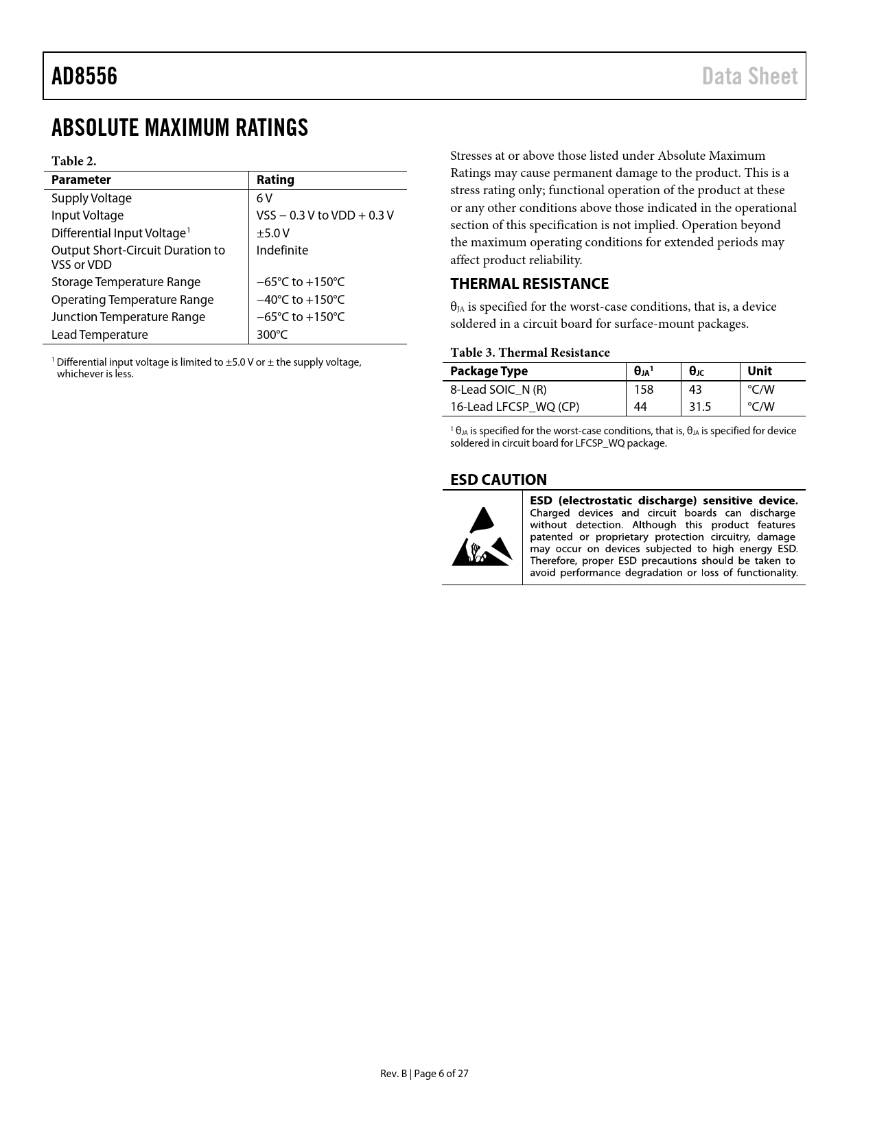 AD8556 Data Sheet ABSOLUTE MAXIMUM RATINGS Table 2 Parameter Rating THERMAL RESISTANCE Table 3 Thermal Resistance