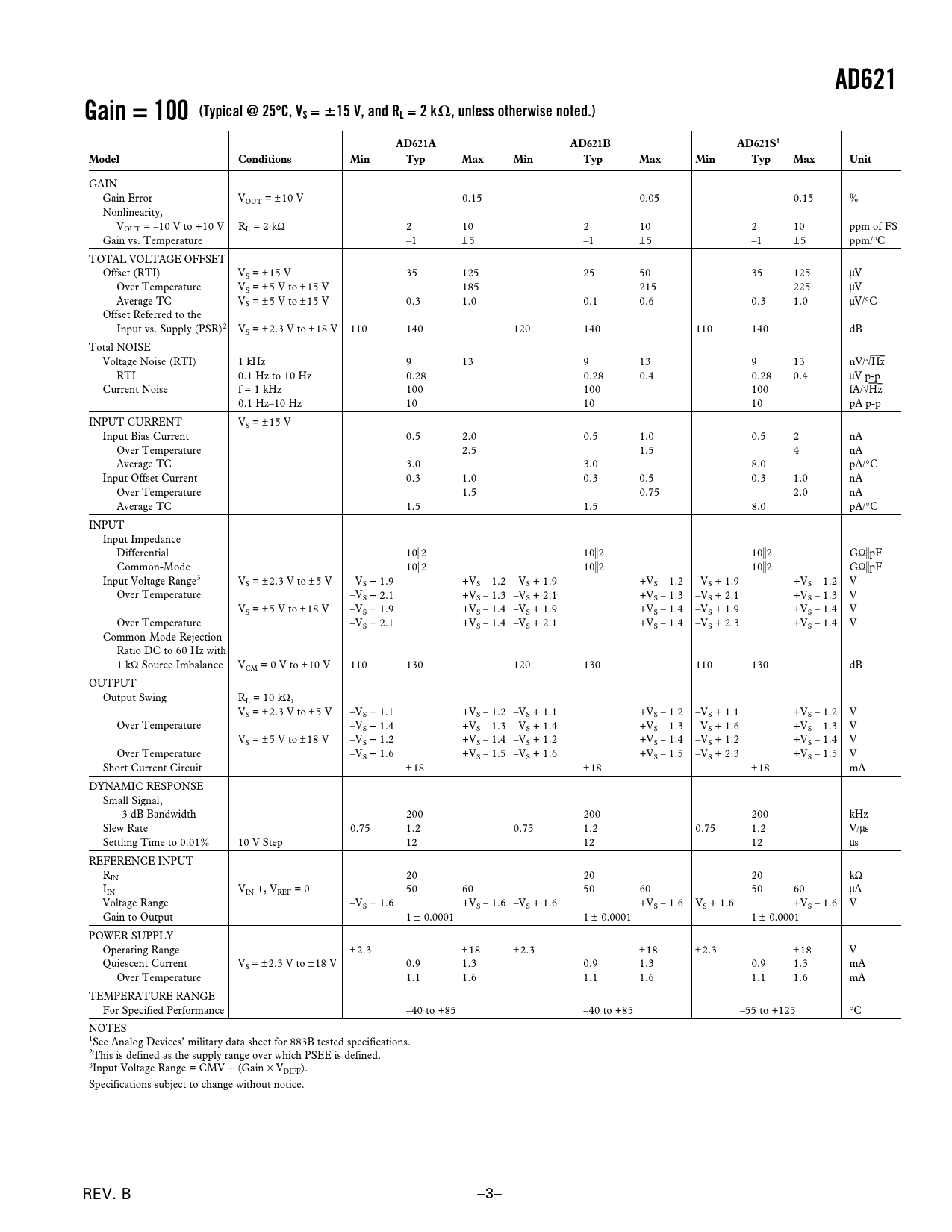 AD621Gain = 100 (Typical @ 25 ⴗ C, VS = ⴞ 15 V, and RL = 2 k ⍀ , unless otherwise noted.)AD621AAD621BAD621S1ModelConditionsMinTypMaxMinTypMaxMinTypMaxUnit GAIN Gain Error VOUT = ± 10 V 0.15 0.05 0.15 % Nonlinearity, VOUT = –10 V to +10 V RL = 2 kΩ 2 10 2 10 2 10 ppm of FS Gain vs. Temperature –1 ±5 –1 ±5 –1 ±5 ppm/°C TOTAL VOLTAGE OFFSET Offset (RTI) VS = ± 15 V 35 125 25 50 35 125 µV Over Temperature VS = ± 5 V to ± 15 V 185 215 225 µV Average TC VS = ± 5 V to ± 15 V 0.3 1.0 0.1 0.6 0.3 1.0 µV/°C Offset Referred to the Input vs. Supply (PSR)2 VS = ± 2.3 V to ± 18 V 110 140 120 140 110 140 dB Total NOISE Voltage Noise (RTI) 1 kHz 9 13 9 13 9 13 nV/√Hz RTI 0.1 Hz to 10 Hz 0.28 0.28 0.4 0.28 0.4 µV p-p Current Noise f = 1 kHz 100 100 100 fA/√Hz 0.1 Hz–10 Hz 10 10 10 pA p-p INPUT CURRENT VS = ± 15 V Input Bias Current 0.5 2.0 0.5 1.0 0.5 2 nA Over Temperature 2.5 1.5 4 nA Average TC 3.0 3.0 8.0 pA/°C Input Offset Current 0.3 1.0 0.3 0.5 0.3 1.0 nA Over Temperature 1.5 0.75 2.0 nA Average TC 1.5 1.5 8.0 pA/°C INPUT Input Impedance Differential 10储2 10储2 10储2 GΩ储pF Common-Mode 10储2 10储2 10储2 GΩ储pF Input Voltage Range3 VS = ± 2.3 V to ± 5 V –VS + 1.9 +VS – 1.2 –VS + 1.9 +VS – 1.2 –VS + 1.9 +VS – 1.2 V Over Temperature –VS + 2.1 +VS – 1.3 –VS + 2.1 +VS – 1.3 –VS + 2.1 +VS – 1.3 V VS = ± 5 V to ± 18 V –VS + 1.9 +VS – 1.4 –VS + 1.9 +VS – 1.4 –VS + 1.9 +VS – 1.4 V Over Temperature –VS + 2.1 +VS – 1.4 –VS + 2.1 +VS – 1.4 –VS + 2.3 +VS – 1.4 V Common-Mode Rejection Ratio DC to 60 Hz with 1 kΩ Source Imbalance VCM = 0 V to ± 10 V 110 130 120 130 110 130 dB OUTPUT Output Swing RL = 10 kΩ, VS = ± 2.3 V to ± 5 V –VS + 1.1 +VS – 1.2 –VS + 1.1 +VS – 1.2 –VS + 1.1 +VS – 1.2 V Over Temperature –VS + 1.4 +VS – 1.3 –VS + 1.4 +VS – 1.3 –VS + 1.6 +VS – 1.3 V VS = ± 5 V to ± 18 V –VS + 1.2 +VS – 1.4 –VS + 1.2 +VS – 1.4 –VS + 1.2 +VS – 1.4 V Over Temperature –VS + 1.6 +VS – 1.5 –VS + 1.6 +VS – 1.5 –VS + 2.3 +VS – 1.5 V Short Current Circuit ±18 ±18 ±18 mA DYNAMIC RESPONSE Small Signal, –3 dB Bandwidth 200 200 200 kHz Slew Rate 0.75 1.2 0.75 1.2 0.75 1.2 V/µs Settling Time to 0.01% 10 V Step 12 12 12 µs REFERENCE INPUT RIN 20 20 20 kΩ IIN VIN +, VREF = 0 50 60 50 60 50 60 µA Voltage Range –VS + 1.6 +VS – 1.6 –VS + 1.6 +VS – 1.6 VS + 1.6 +VS – 1.6 V Gain to Output 1 ± 0.0001 1 ± 0.0001 1 ± 0.0001 POWER SUPPLY Operating Range ±2.3 ±18 ±2.3 ±18 ±2.3 ±18 V Quiescent Current VS = ± 2.3 V to ± 18 V 0.9 1.3 0.9 1.3 0.9 1.3 mA Over Temperature 1.1 1.6 1.1 1.6 1.1 1.6 mA TEMPERATURE RANGE For Specified Performance –40 to +85 –40 to +85 –55 to +125 °C NOTES 1See Analog Devices’ military data sheet for 883B tested specifications. 2This is defined as the supply range over which PSEE is defined. 3Input Voltage Range = CMV + (Gain × VDIFF). Specifications subject to change without notice. REV. B –3–