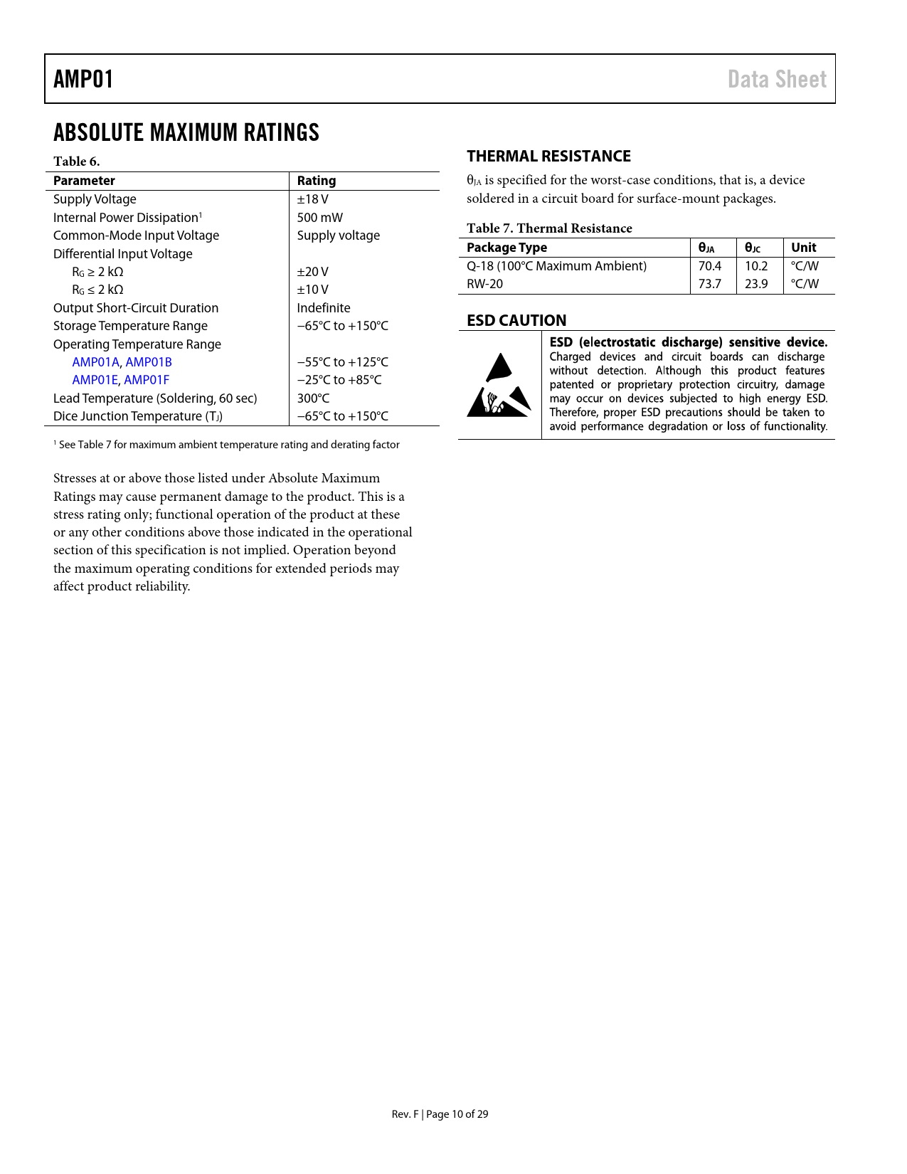 Pages / Page29 / 10 — AMP01. Data Sheet. ABSOLUTE MAXIMUM RATINGS Table 6. THERMAL RESISTANCE. …