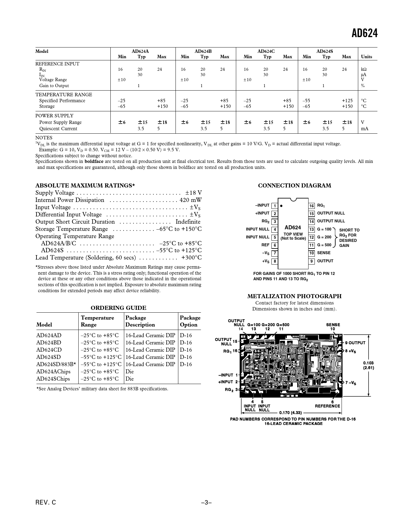 AD624 Model AD624A AD624B AD624C AD624S Min Typ Max Units boldface ABSOLUTE MAXIMUM RATINGS* CONNECTION DIAGRAM –INPUT 16 RG1 +INPUT