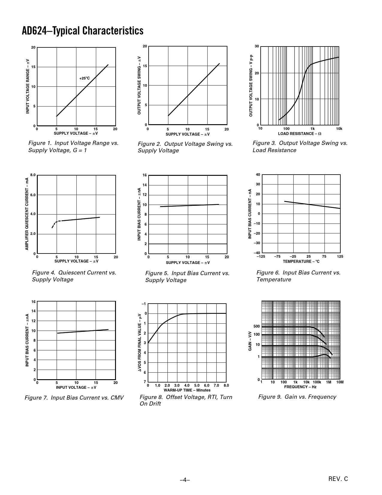 AD624–Typical Characteristics202030VV ⴞ ⴞ –V p-p– 1515–20+25 ⴗ C10101055INPUT VOLTAGE RANGEOUTPUT VOLTAGE SWINGOUTPUT VOLTAGE SWING0000510152005101520101001k10kSUPPLY VOLTAGE – ⴞ VSUPPLY VOLTAGE – ⴞ VLOAD RESISTANCE – ⍀ Figure 1. Input Voltage Range vs. Figure 2. Output Voltage Swing vs. Figure 3. Output Voltage Swing vs. Supply Voltage, G = 1 Supply Voltage Load Resistance 8.01640mA –1430nA6.012nA ⴞ 20––10104.0806–102.04–20INPUT BIAS CURRENTINPUT BIAS CURRENT2–30AMPLIFIER QUIESCENT CURRENT00–400510152005101520–125–75–252575125SUPPLY VOLTAGE – ⴞ VSUPPLY VOLTAGE – ⴞ VTEMPERATURE – ⴗ C Figure 4. Quiescent Current vs. Figure 5. Input Bias Current vs. Figure 6. Input Bias Current vs. Supply Voltage Supply Voltage Temperature 16–1140VnA 12 ⴞ ––1500102100V/V8–3106GAIN4145INPUT BIAS CURRENTVOS FROM FINAL VALUE2 ⌬ 6000510152071101001k10k 100k1M10M01.02.03.04.05.06.07.08.0INPUT VOLTAGE – ⴞ VFREQUENCY – HzWARM-UP TIME – Minutes Figure 7. Input Bias Current vs. CMV Figure 8. Offset Voltage, RTI, Turn Figure 9. Gain vs. Frequency On Drift –4– REV. C