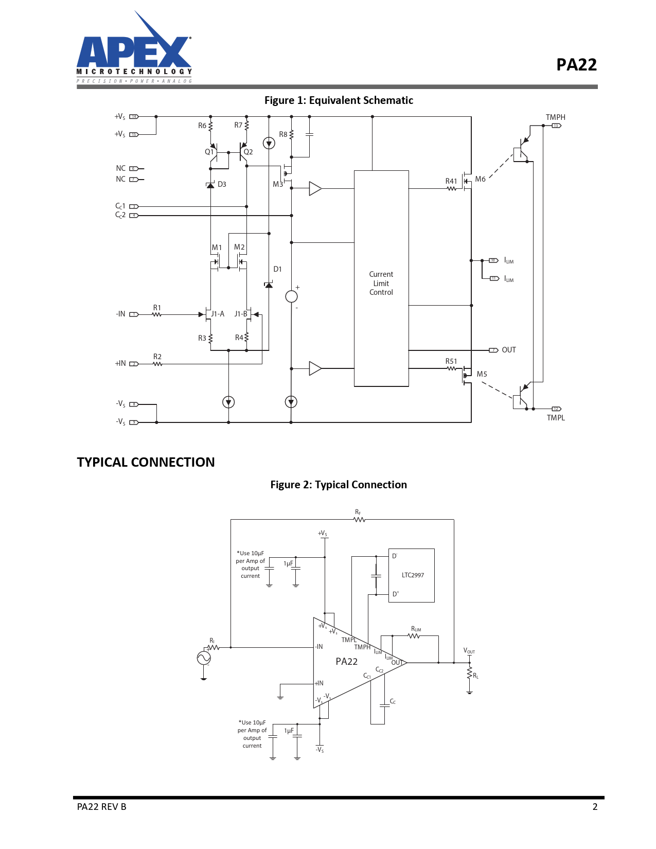 PA22. Figure 1: Equivalent Schematic. +VS. TMPH. R41. CC1. CC2. ILIM. Current. Limit. Control. -IN. J1-A. J1-B. OUT. +IN. R51. -VS. TMPL. TYPICAL CONNECTION