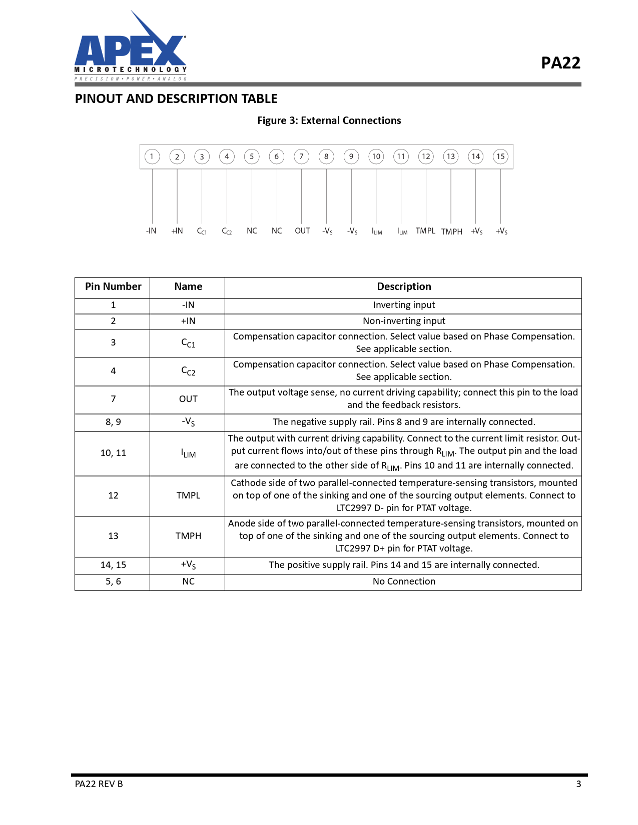 PA22. PINOUT AND DESCRIPTION TABLE. Figure 3: External Connections. -IN. +IN. CC1. CC2. OUT. -VS. ILIM. ILIM TMPL TMPH +VS. +VS. Pin Number. Name