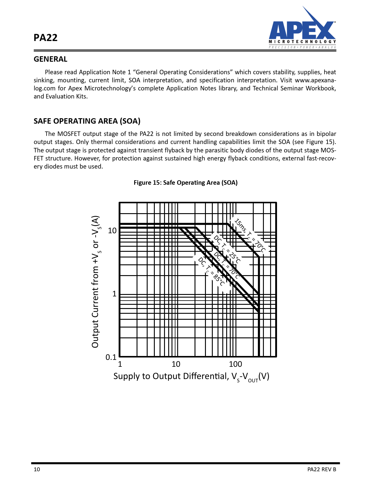 The MOSFET output stage of the PA22 is not limited by second breakdown considerations as in bipolar output stages. Only thermal considerations and current handling capabilities limit the SOA (see Figure 15). The output stage is protected against transient flyback by the parasitic body diodes of the output stage MOS- FET structure. However, for protection against sustained high energy flyback conditions, external fast-recov- ery diodes must be used.