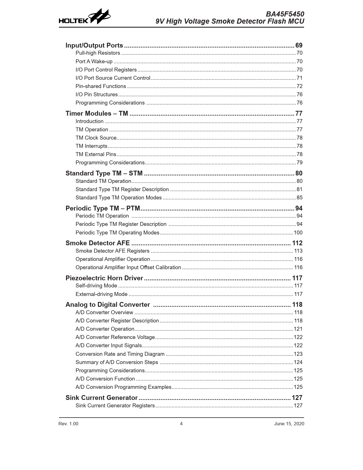 link to page 69 link to page 70 link to page 70 link to page 70 link to page 71 link to page 72 link to page 76 link to page 76 link to page 77 link to page 77 link to page 77 link to page 78 link to page 78 link to page 78 link to page 79 link to page 80 link to page 80 link to page 81 link to page 85 link to page 94 link to page 94 link to page 94 link to page 100 link to page 112 link to page 113 link to page 116 link to page 116 link to page 117 link to page 117 link to page 117 link to page 118 link to page 118 link to page 118 link to page 121 link to page 122 link to page 122 link to page 123 link to page 124 link to page 125 link to page 125 link to page 125 link to page 127 link to page 127 BA45F5450BA45F54509V High Voltage Smoke Detector Flash MCU9V High Voltage Smoke Detector Flash MCUInput/Output Ports ..69 Pull-high Resistors ..70 Port A Wake-up ...70 I/O Port Control Registers ...70 I/O Port Source Current Control ..71 Pin-shared Functions ..72 I/O Pin Structures ..76 Programming Considerations ...76 Timer Modules – TM ...77 Introduction ...77 TM Operation ..77 TM Clock Source ...78 TM Interrupts ...78 TM External Pins ...78 Programming Considerations ..79 Standard Type TM – STM ...80 Standard TM Operation ...80 Standard Type TM Register Description ...81 Standard Type TM Operation Modes ..85 Periodic Type TM – PTM ...94 Periodic TM Operation ...94 Periodic Type TM Register Description ..94 Periodic Type TM Operating Modes ..100 Smoke Detector AFE .. 112 Smoke Detector AFE Registers .. 113 Operational Amplifier Operation .. 116 Operational Amplifier Input Offset Calibration ... 116 Piezoelectric Horn Driver ... 117 Self-driving Mode .. 117 External-driving Mode ... 117 Analog to Digital Converter .. 118 A/D Converter Overview ... 118 A/D Converter Register Description .. 118 A/D Converter Operation ...121 A/D Converter Reference Voltage ...122 A/D Converter Input Signals ..122 Conversion Rate and Timing Diagram ..123 Summary of A/D Conversion Steps ..124 Programming Considerations ..125 A/D Conversion Function ..125 A/D Conversion Programming Examples ..125 Sink Current Generator ..127 Sink Current Generator Registers ...127 Rev. 1.00 4 June 15, 2020 Rev. 1.00 5 June 15, 2020 Document Outline Features CPU Features Peripheral Features General Description Block Diagram Pin Assignment Pin Description Absolute Maximum Ratings D.C. Characteristics Operating Voltage Characteristics Operating Current Characteristics Standby Current Characteristics A.C. Characteristics High Speed Internal Oscillator – HIRC – Frequency Accuracy Low Speed Internal Oscillator – LIRC System Start Up Time Characteristics Input/Output Characteristics Memory Characteristics LVD & LVR Electrical Characteristics A/D Converter Electrical Characteristics Reference Voltage Characteristics Sink Current Generator Electrical Characteristics Sink Current Generator Characteristic Curves Operational Amplifier Electrical Characteristics – Smoke Detector AFE 16-bit Voice D/A Converter Electrical Characteristics LDO Electrical Characteristics Piezoelectric Horn Driver Characteristics Power-on Reset Characteristics System Architecture Clocking and Pipelining Program Counter Stack Arithmetic and Logic Unit – ALU Flash Program Memory Structure Special Vectors Look-up Table Table Program Example In Circuit Programming – ICP On Chip Debug Support – OCDS In Application Programming – IAP Data Memory Structure Data Memory Addressing General Purpose Data Memory Special Purpose Data Memory Special Function Register Description Indirect Addressing Registers – IAR0, IAR1, IAR2 Memory Pointers – MP0, MP1L, MP1H, MP2L, MP2H Accumulator – ACC Program Counter Low Register – PCL Look-up Table Registers – TBLP, TBHP, TBLH Status Register – STATUS EEPROM Data Memory EEPROM Data Memory Structure EEPROM Registers Reading Data from the EEPROM Writing Data to the EEPROM Write Protection EEPROM Interrupt Programming Considerations Oscillators Oscillator Overview System Clock Configurations Internal High Speed RC Oscillator – HIRC Internal 32kHz Oscillator – LIRC Operating Modes and System Clocks System Clocks System Operation Modes Control Registers Operating Mode Switching Standby Current Considerations Wake-up Watchdog Timer Watchdog Timer Clock Source Watchdog Timer Control Register Watchdog Timer Operation Reset and Initialisation Reset Functions Reset Initial Conditions Input/Output Ports Pull-high Resistors Port A Wake-up I/O Port Control Registers I/O Port Source Current Control Pin-shared Functions I/O Pin Structures Programming Considerations Timer Modules – TM Introduction TM Operation TM Clock Source TM Interrupts TM External Pins Programming Considerations Standard Type TM – STM Standard TM Operation Standard Type TM Register Description Standard Type TM Operation Modes Periodic Type TM – PTM Periodic TM Operation Periodic Type TM Register Description Periodic Type TM Operating Modes Smoke Detector AFE Smoke Detector AFE Registers Operational Amplifier Operation Operational Amplifier Input Offset Calibration Piezoelectric Horn Driver Self-driving Mode External-driving Mode Analog to Digital Converter A/D Converter Overview A/D Converter Register Description A/D Converter Operation A/D Converter Reference Voltage A/D Converter Input Signals Conversion Rate and Timing Diagram Summary of A/D Conversion Steps Programming Considerations A/D Conversion Function A/D Conversion Programming Examples Sink Current Generator Sink Current Generator Registers 16-bit Voice D/A Converter D/A Converter Registers Serial Interface Module – SIM SPI Interface I2C Interface UART Interface UART External Pins UART Data Transfer Scheme UART Status and Control Registers Baud Rate Generator UART Setup and Control UART Transmitter UART Receiver Managing Receiver Errors UART Interrupt Structure UART Power Down and Wake-up Low Voltage Detector – LVD LVD Register LVD Operation Interrupts Interrupt Registers Interr